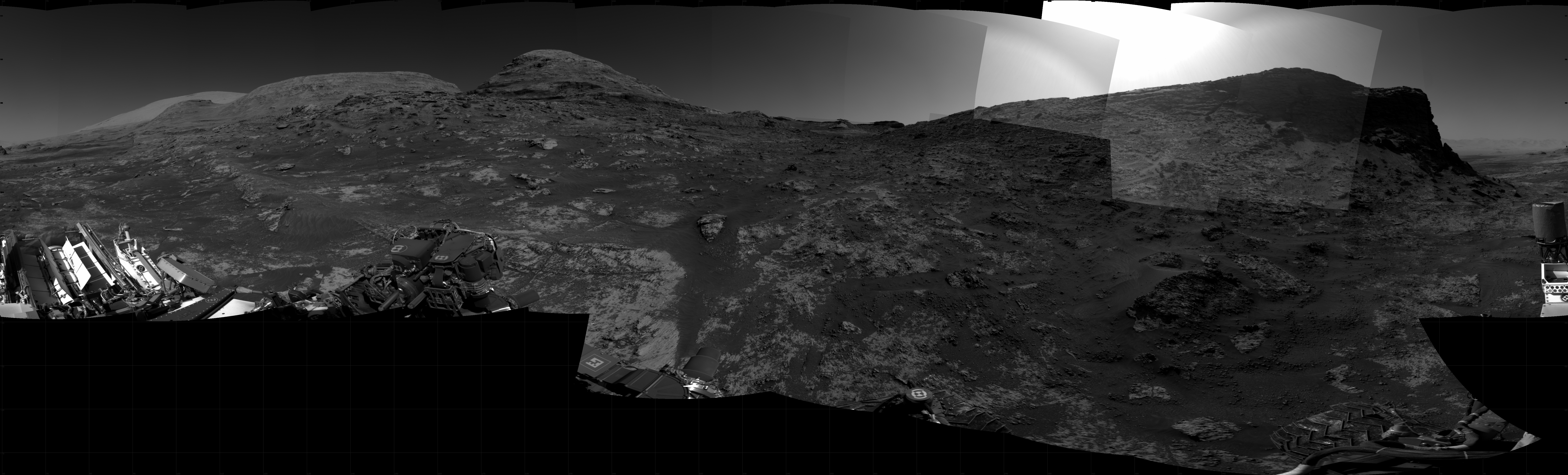 NASA's Mars rover Curiosity took 29 images in Gale Crater using its mast-mounted Right Navigation Camera (Navcam) to create this mosaic. The seam-corrected mosaic provides a 360-degree cylindrical projection panorama of the Martian surface centered at 240 degrees azimuth (measured clockwise from north). Curiosity took the images on July 26, 2021, Sol 3188 of the Mars Science Laboratory mission at drive 2638, site number 89. The local mean solar time for the image exposures was 2 PM. Each Navcam image has a 45 degree field of view. CREDIT: NASA/JPL-Caltech