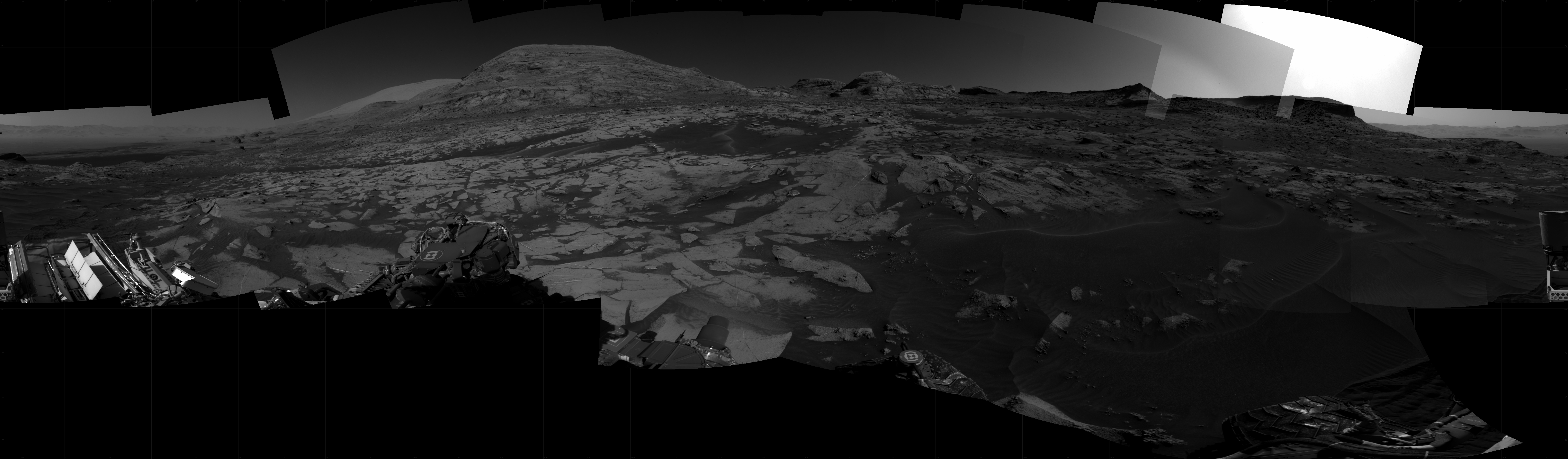 NASA's Mars rover Curiosity took 25 images in Gale Crater using its mast-mounted Right Navigation Camera (Navcam) to create this mosaic. The seam-corrected mosaic provides a 360-degree cylindrical projection panorama of the Martian surface centered at 185 degrees azimuth (measured clockwise from north). Curiosity took the images on August 24, 2021, Sol 3216 of the Mars Science Laboratory mission at drive 2990, site number 90. The local mean solar time for the image exposures was 2 PM. Each Navcam image has a 45 degree field of view. CREDIT: NASA/JPL-Caltech