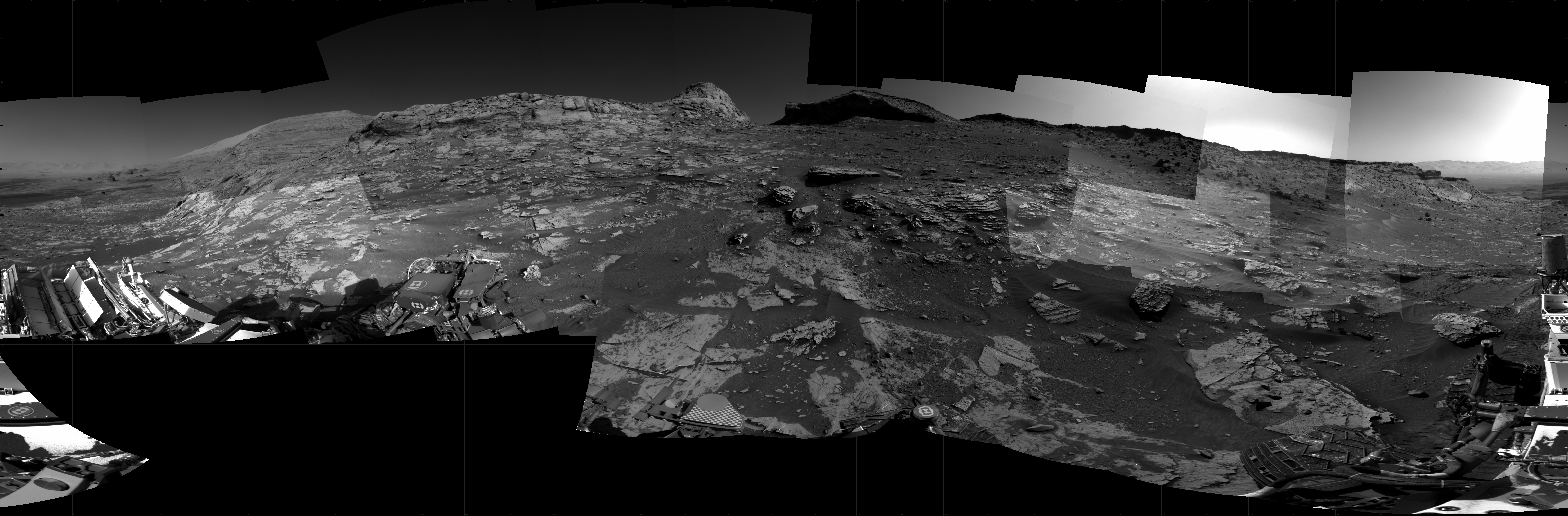 NASA's Mars rover Curiosity took 36 images in Gale Crater using its mast-mounted Right Navigation Camera (Navcam) to create this mosaic. The seam-corrected mosaic provides a 360-degree cylindrical projection panorama of the Martian surface centered at 213 degrees azimuth (measured clockwise from north). Curiosity took the images on November 17, 2021, Sols 3299-3286 of the Mars Science Laboratory mission at drive 2132, site number 91. The local mean solar time for the image exposures was from 8 AM to 3 PM. Each Navcam image has a 45 degree field of view. CREDIT: NASA/JPL-Caltech