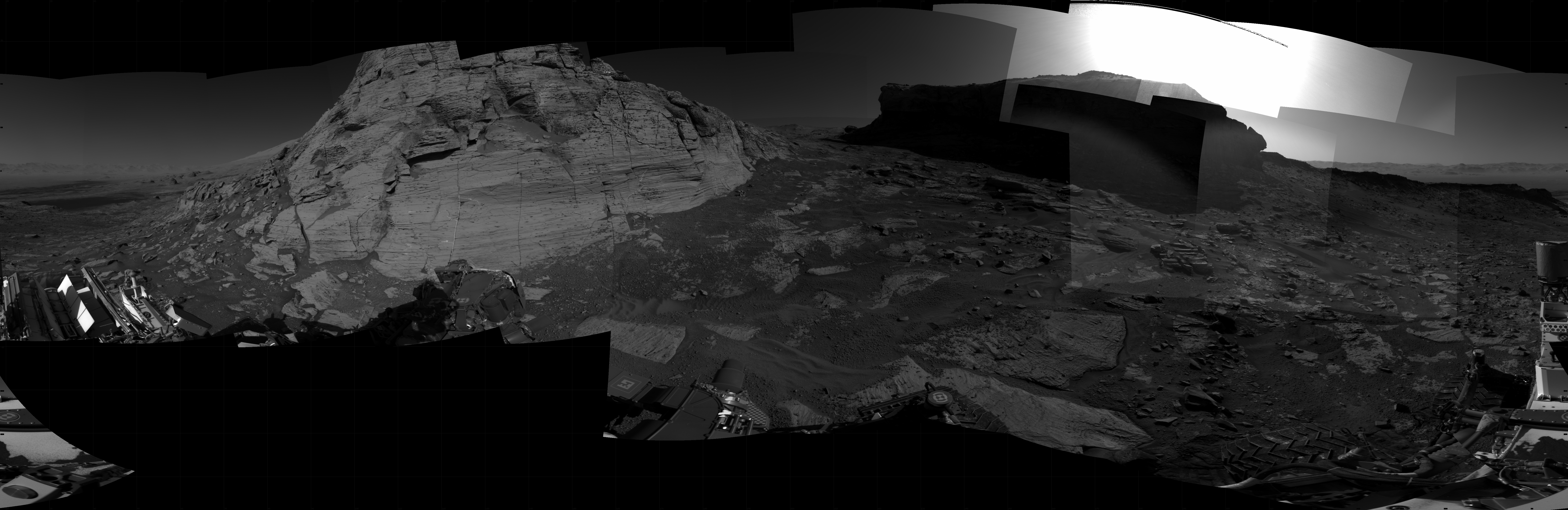 NASA's Mars rover Curiosity took 31 images in Gale Crater using its mast-mounted Right Navigation Camera (Navcam) to create this mosaic. The seam-corrected mosaic provides a 360-degree cylindrical projection panorama of the Martian surface centered at 199 degrees azimuth (measured clockwise from north). Curiosity took the images on December 07, 2021, Sol 3319 of the Mars Science Laboratory mission at drive 3204, site number 91. The local mean solar time for the image exposures was 3 PM. Each Navcam image has a 45 degree field of view. CREDIT: NASA/JPL-Caltech