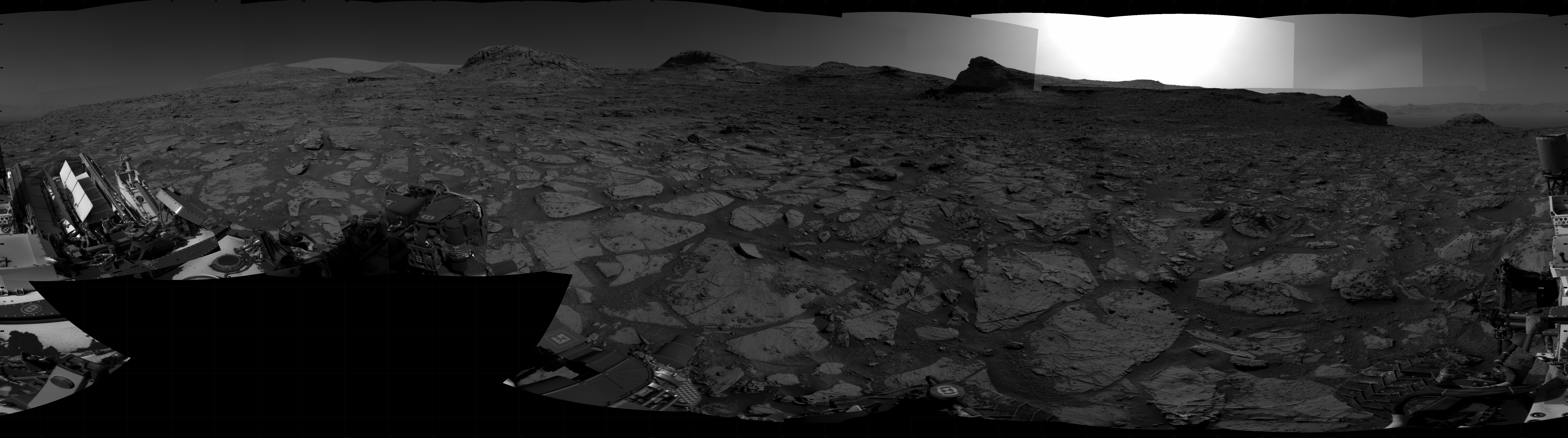 NASA's Mars rover Curiosity took 31 images in Gale Crater using its mast-mounted Right Navigation Camera (Navcam) to create this mosaic. The seam-corrected mosaic provides a 360-degree cylindrical projection panorama of the Martian surface centered at 211 degrees azimuth (measured clockwise from north). Curiosity took the images on December 20, 2021, Sol 3331 of the Mars Science Laboratory mission at drive 768, site number 92. The local mean solar time for the image exposures was from 2 PM to 3 PM. Each Navcam image has a 45 degree field of view. CREDIT: NASA/JPL-Caltech