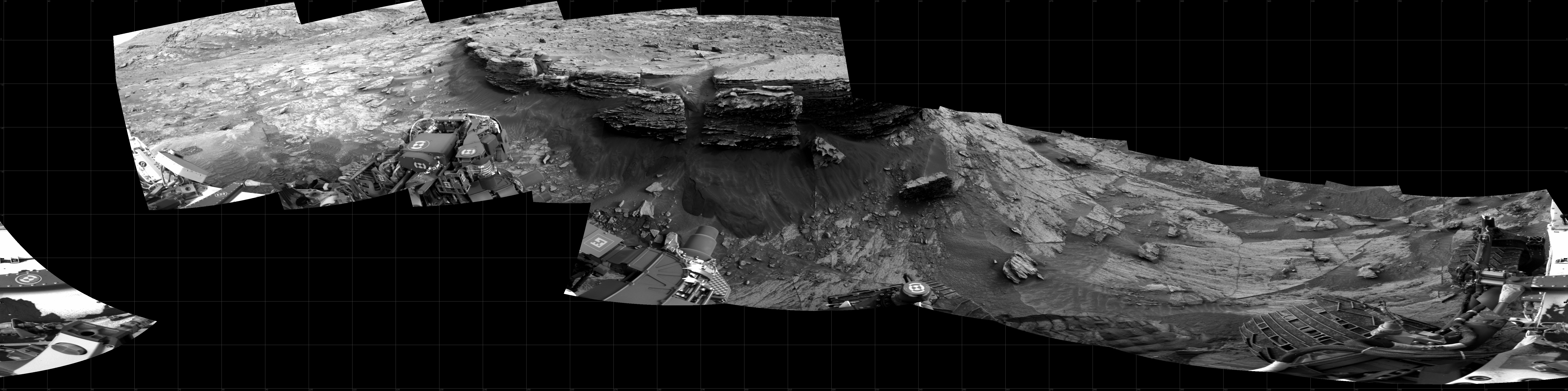 NASA's Mars rover Curiosity took 12 images in Gale Crater using its mast-mounted Right Navigation Camera (Navcam) to create this mosaic. The seam-corrected mosaic provides a 360-degree cylindrical projection panorama of the Martian surface centered at 209 degrees azimuth (measured clockwise from north). Curiosity took the images on January 11, 2022, Sol 3353 of the Mars Science Laboratory mission at drive 2254, site number 92. The local mean solar time for the image exposures was from 3 PM to 4 PM. Each Navcam image has a 45 degree field of view. CREDIT: NASA/JPL-Caltech
