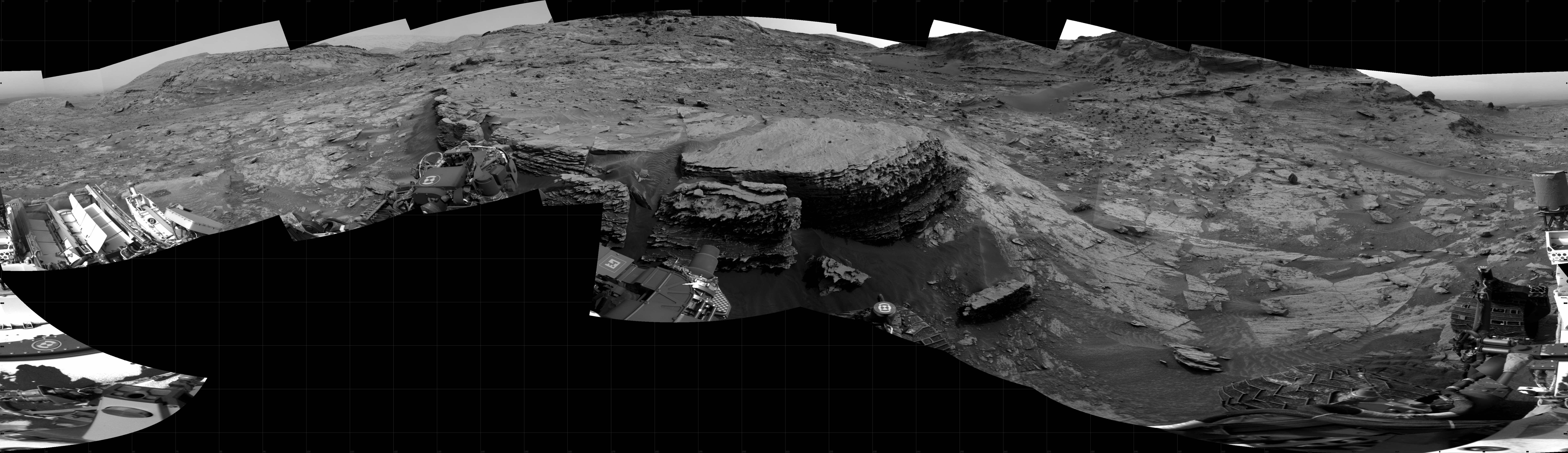 NASA's Mars rover Curiosity took 18 images in Gale Crater using its mast-mounted Right Navigation Camera (Navcam) to create this mosaic. The seam-corrected mosaic provides a 360-degree cylindrical projection panorama of the Martian surface centered at 210 degrees azimuth (measured clockwise from north). Curiosity took the images on January 12, 2022, Sol 3354 of the Mars Science Laboratory mission at drive 2272, site number 92. The local mean solar time for the image exposures was 2 PM. Each Navcam image has a 45 degree field of view. CREDIT: NASA/JPL-Caltech