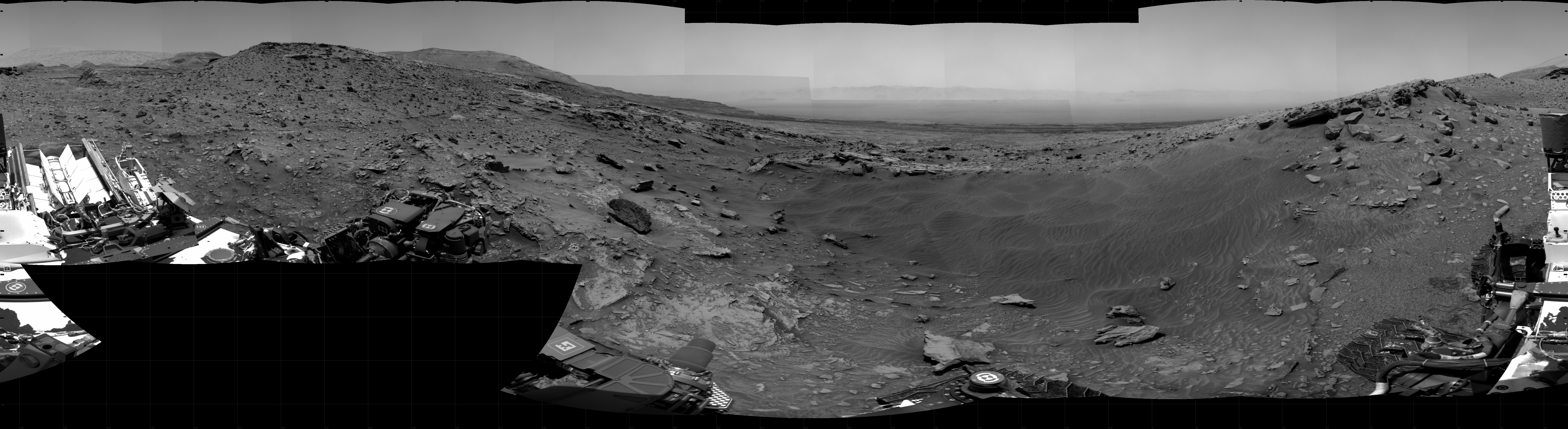 NASA's Mars rover Curiosity took 31 images in Gale Crater using its mast-mounted Right Navigation Camera (Navcam) to create this mosaic. The seam-corrected mosaic provides a 360-degree cylindrical projection panorama of the Martian surface centered at 276 degrees azimuth (measured clockwise from north). Curiosity took the images on February 21, 2022, Sol 3393 of the Mars Science Laboratory mission at drive 2164, site number 93. The local mean solar time for the image exposures was from 11 AM to 12 PM. Each Navcam image has a 45 degree field of view. CREDIT: NASA/JPL-Caltech
