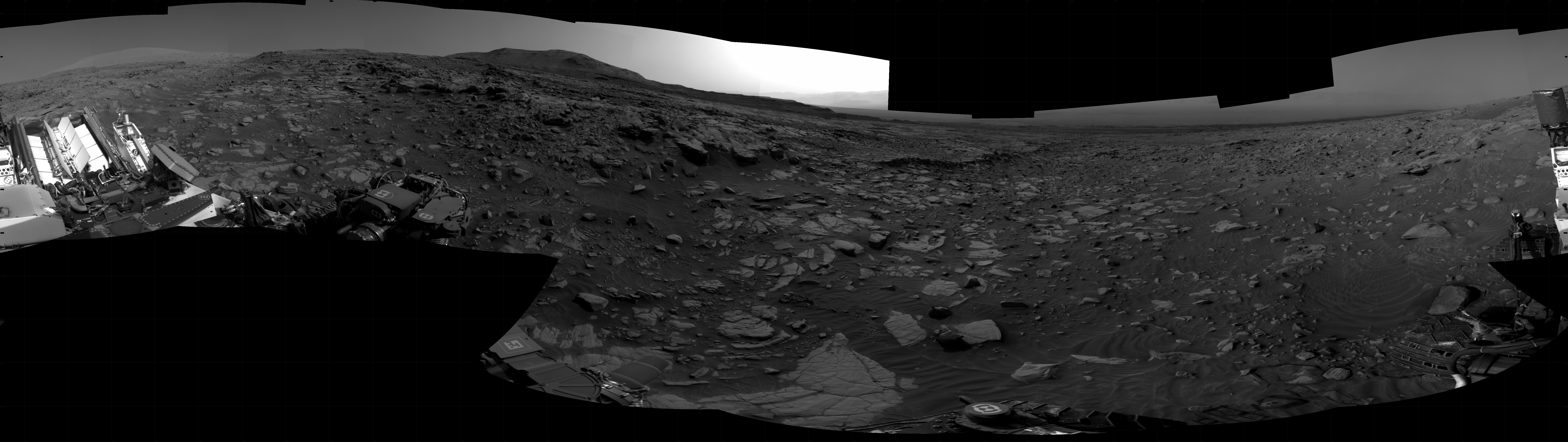 NASA's Mars rover Curiosity took 25 images in Gale Crater using its mast-mounted Right Navigation Camera (Navcam) to create this mosaic. The seam-corrected mosaic provides a 360-degree cylindrical projection panorama of the Martian surface centered at 254 degrees azimuth (measured clockwise from north). Curiosity took the images on March 14, 2022, Sol 3413 of the Mars Science Laboratory mission at drive 2928, site number 93. The local mean solar time for the image exposures was from 2 PM to 3 PM. Each Navcam image has a 45 degree field of view. CREDIT: NASA/JPL-Caltech