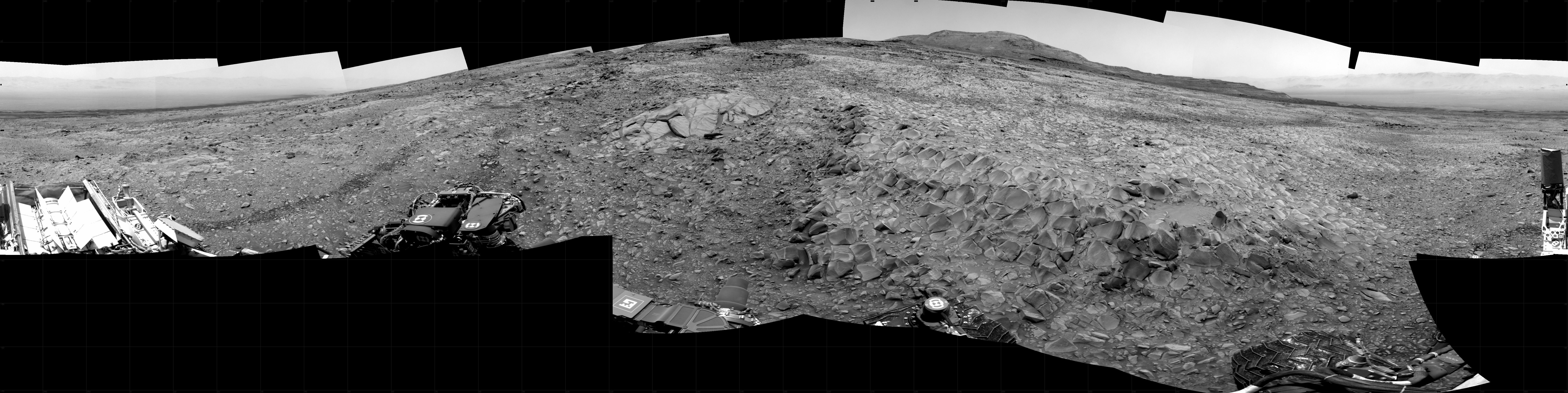 NASA's Mars rover Curiosity took 20 images in Gale Crater using its mast-mounted Right Navigation Camera (Navcam) to create this mosaic. The seam-corrected mosaic provides a 360-degree cylindrical projection panorama of the Martian surface centered at 150 degrees azimuth (measured clockwise from north). Curiosity took the images on March 21, 2022, Sol 3420 of the Mars Science Laboratory mission at drive 3408, site number 93. The local mean solar time for the image exposures was 12 PM. Each Navcam image has a 45 degree field of view. CREDIT: NASA/JPL-Caltech