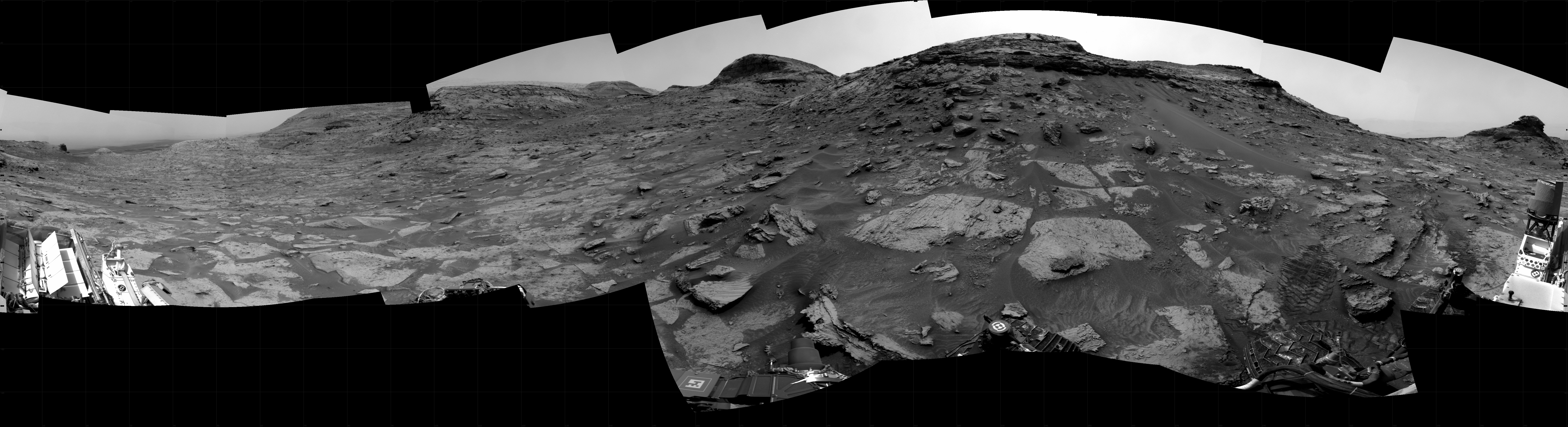 NASA's Mars rover Curiosity took 24 images in Gale Crater using its mast-mounted Right Navigation Camera (Navcam) to create this mosaic. The seam-corrected mosaic provides a 360-degree cylindrical projection panorama of the Martian surface centered at 180 degrees azimuth (measured clockwise from north). Curiosity took the images on May 02, 2022, Sol 3461 of the Mars Science Laboratory mission at drive 2242, site number 94. The local mean solar time for the image exposures was 1 PM. Each Navcam image has a 45 degree field of view. CREDIT: NASA/JPL-Caltech