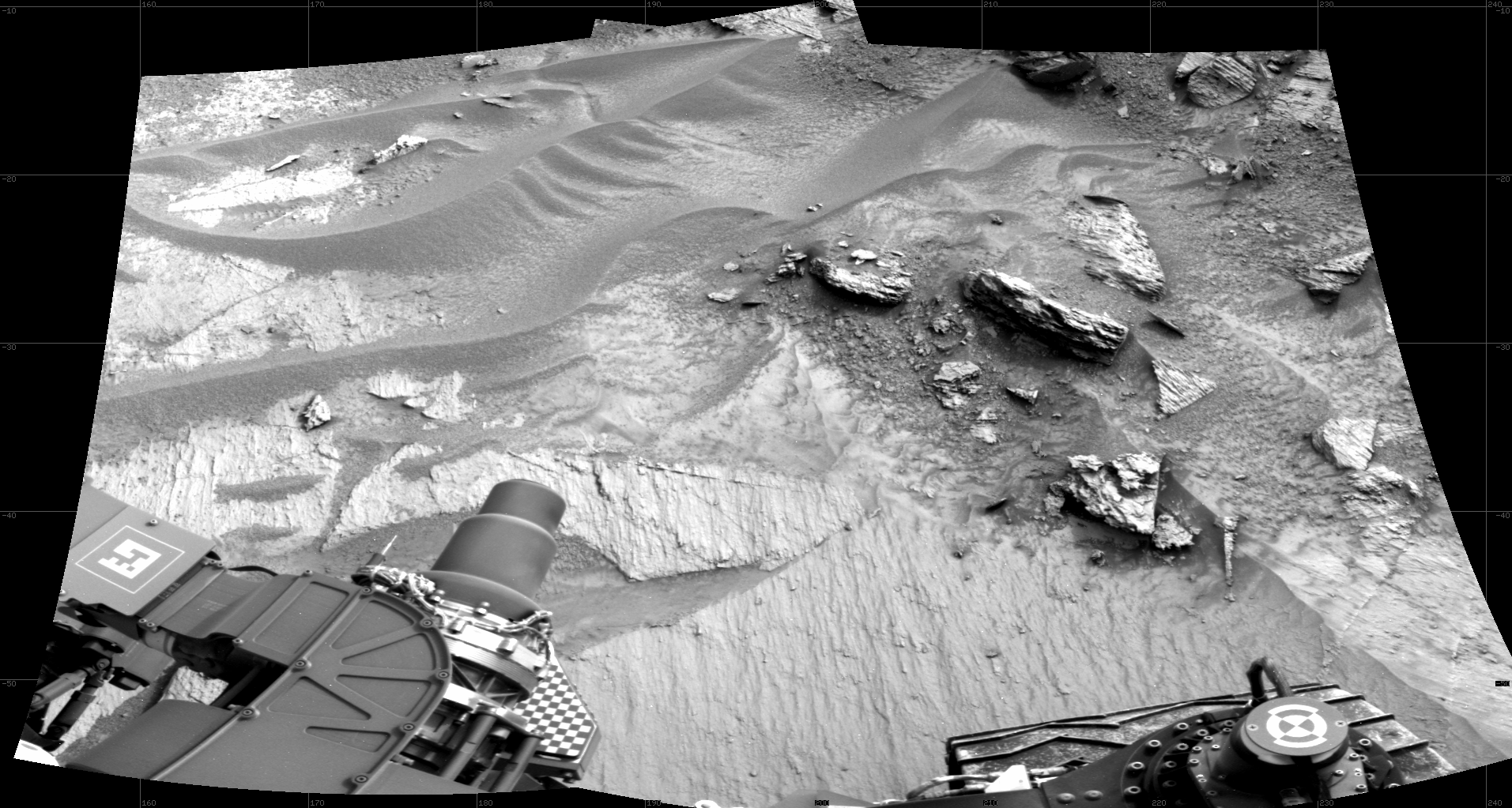 NASA's Mars rover Curiosity took 2 images in Gale Crater using its mast-mounted Right Navigation Camera (Navcam) to create this mosaic. The seam-corrected mosaic provides a 90-degree cylindrical projection panorama of the Martian surface centered at 197 degrees azimuth (measured clockwise from north). Curiosity took the images on May 27, 2022, Sol 3485 of the Mars Science Laboratory mission at drive 2054, site number 95. The local mean solar time for the image exposures was 2 PM. Each Navcam image has a 45 degree field of view. CREDIT: NASA/JPL-Caltech