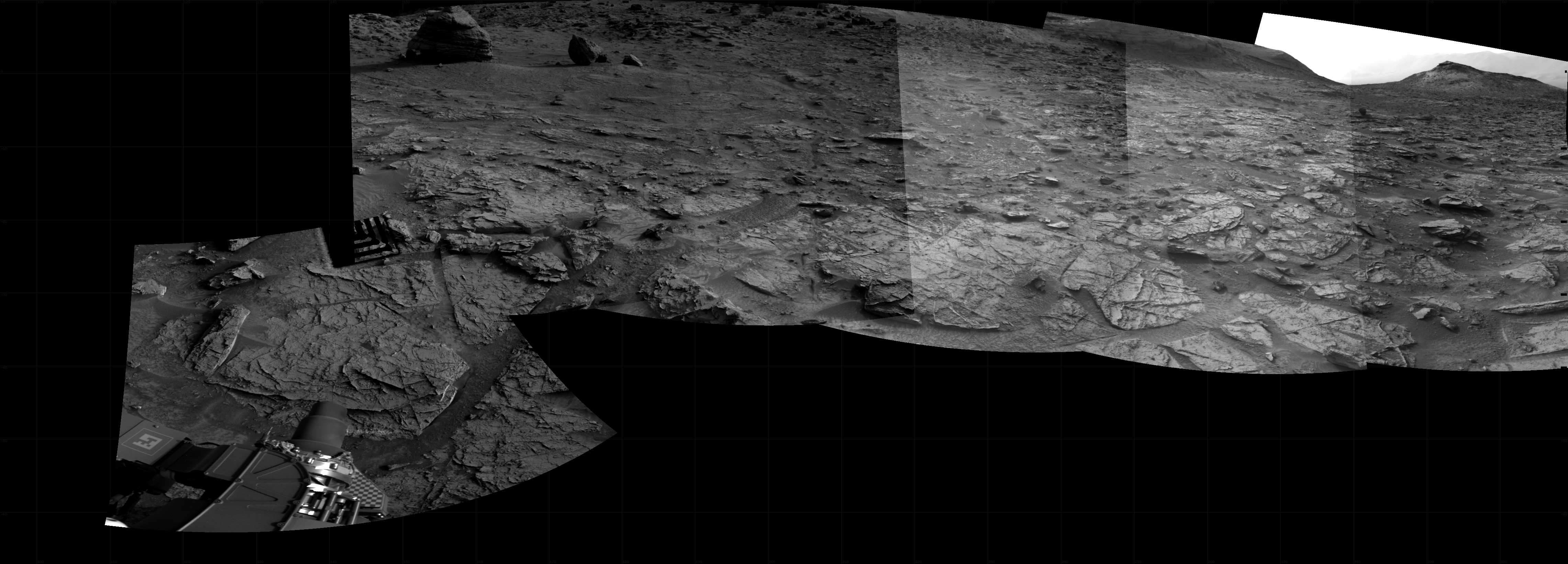 NASA's Mars rover Curiosity took 6 images in Gale Crater using its mast-mounted Right Navigation Camera (Navcam) to create this mosaic. The seam-corrected mosaic provides a 214-degree cylindrical projection panorama of the Martian surface centered at 202 degrees azimuth (measured clockwise from north). Curiosity took the images on July 13, 2022, Sol 3531 of the Mars Science Laboratory mission at drive 324, site number 96. The local mean solar time for the image exposures was 4 PM. Each Navcam image has a 45 degree field of view. CREDIT: NASA/JPL-Caltech