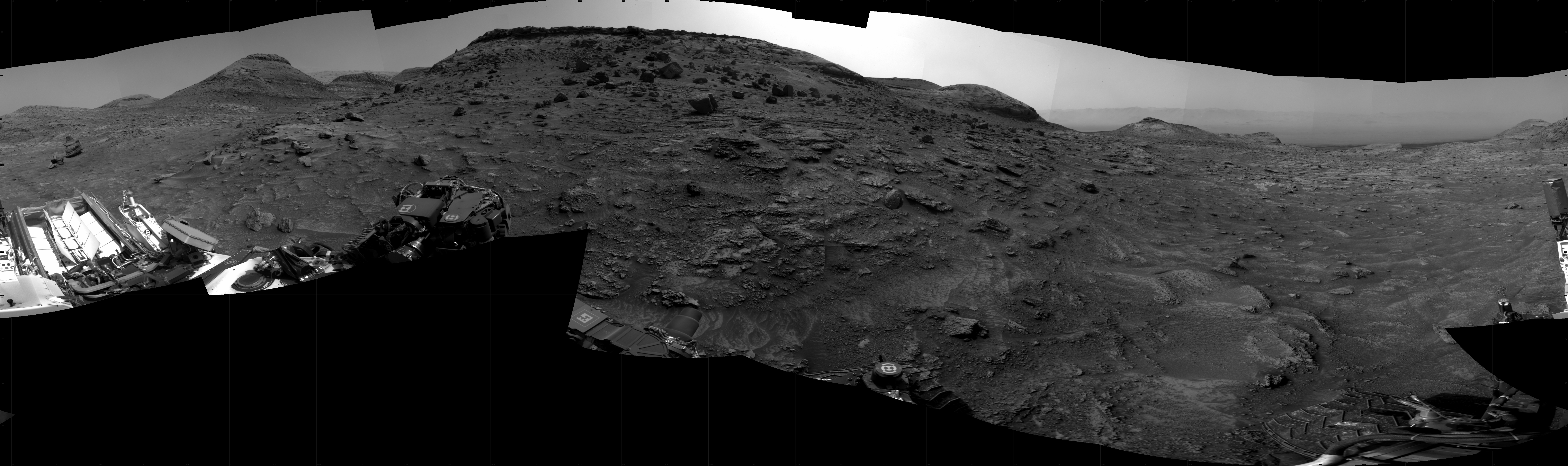 NASA's Mars rover Curiosity took 29 images in Gale Crater using its mast-mounted Right Navigation Camera (Navcam) to create this mosaic. The seam-corrected mosaic provides a 360-degree cylindrical projection panorama of the Martian surface centered at 217 degrees azimuth (measured clockwise from north). Curiosity took the images on July 18, 2022, Sol 3536 of the Mars Science Laboratory mission at drive 642, site number 96. The local mean solar time for the image exposures was 2 PM. Each Navcam image has a 45 degree field of view. CREDIT: NASA/JPL-Caltech