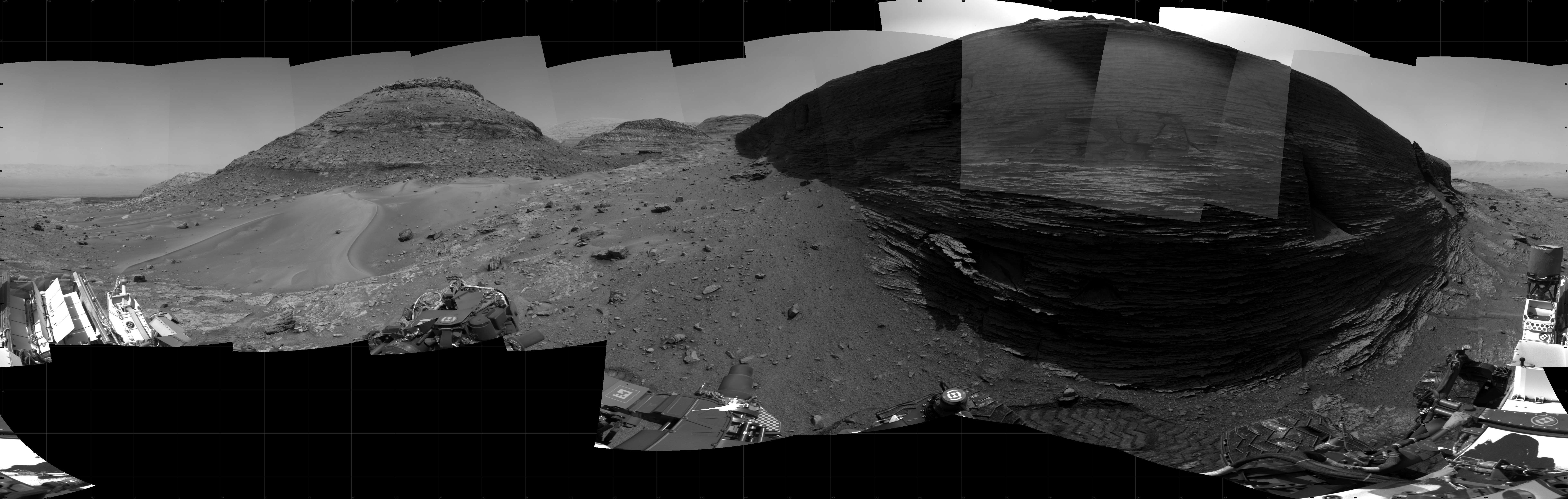 NASA's Mars rover Curiosity took 31 images in Gale Crater using its mast-mounted Right Navigation Camera (Navcam) to create this mosaic. The seam-corrected mosaic provides a 360-degree cylindrical projection panorama of the Martian surface centered at 149 degrees azimuth (measured clockwise from north). Curiosity took the images on August 08, 2022, Sol 3556 of the Mars Science Laboratory mission at drive 2470, site number 96. The local mean solar time for the image exposures was 2 PM. Each Navcam image has a 45 degree field of view. CREDIT: NASA/JPL-Caltech