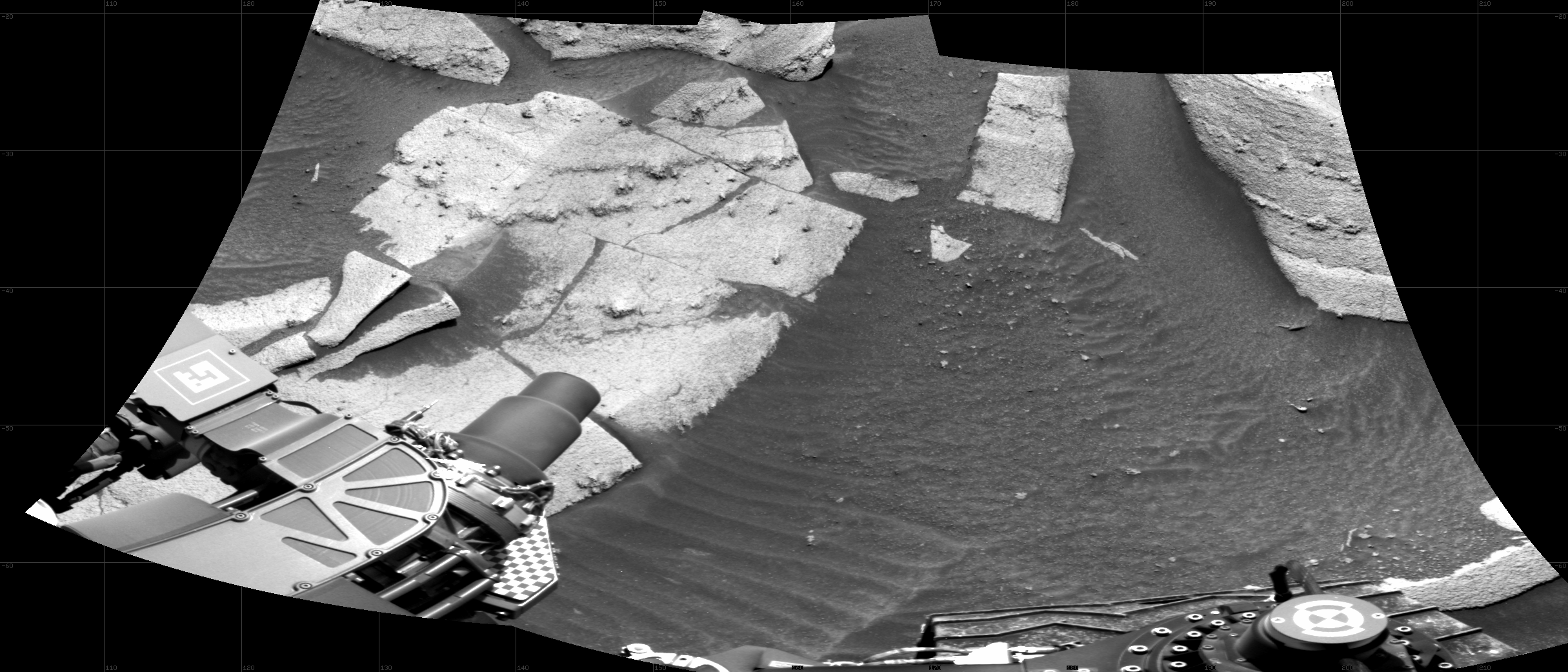 NASA's Mars rover Curiosity took 2 images in Gale Crater using its mast-mounted Right Navigation Camera (Navcam) to create this mosaic. The seam-corrected mosaic provides a 114-degree cylindrical projection panorama of the Martian surface centered at 160 degrees azimuth (measured clockwise from north). Curiosity took the images on August 28, 2022, Sol 3576 of the Mars Science Laboratory mission at drive 966, site number 97. The local mean solar time for the image exposures was 1 PM. Each Navcam image has a 45 degree field of view. CREDIT: NASA/JPL-Caltech