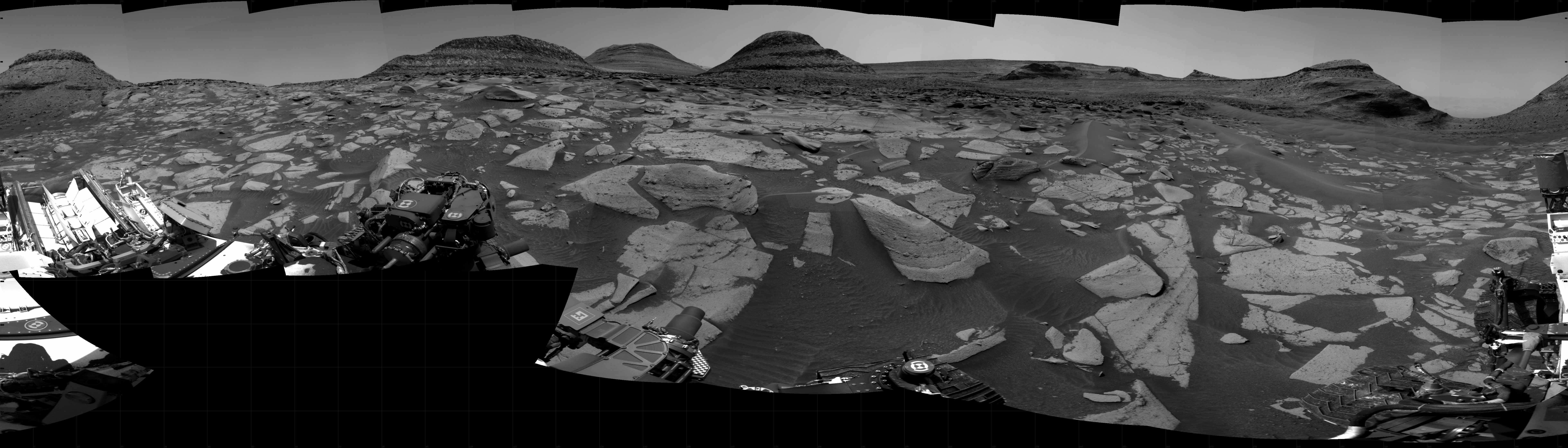 NASA's Mars rover Curiosity took 31 images in Gale Crater using its mast-mounted Right Navigation Camera (Navcam) to create this mosaic. The seam-corrected mosaic provides a 360-degree cylindrical projection panorama of the Martian surface centered at 172 degrees azimuth (measured clockwise from north). Curiosity took the images on August 28, 2022, Sol 3576 of the Mars Science Laboratory mission at drive 966, site number 97. The local mean solar time for the image exposures was from 1 PM to 2 PM. Each Navcam image has a 45 degree field of view. CREDIT: NASA/JPL-Caltech