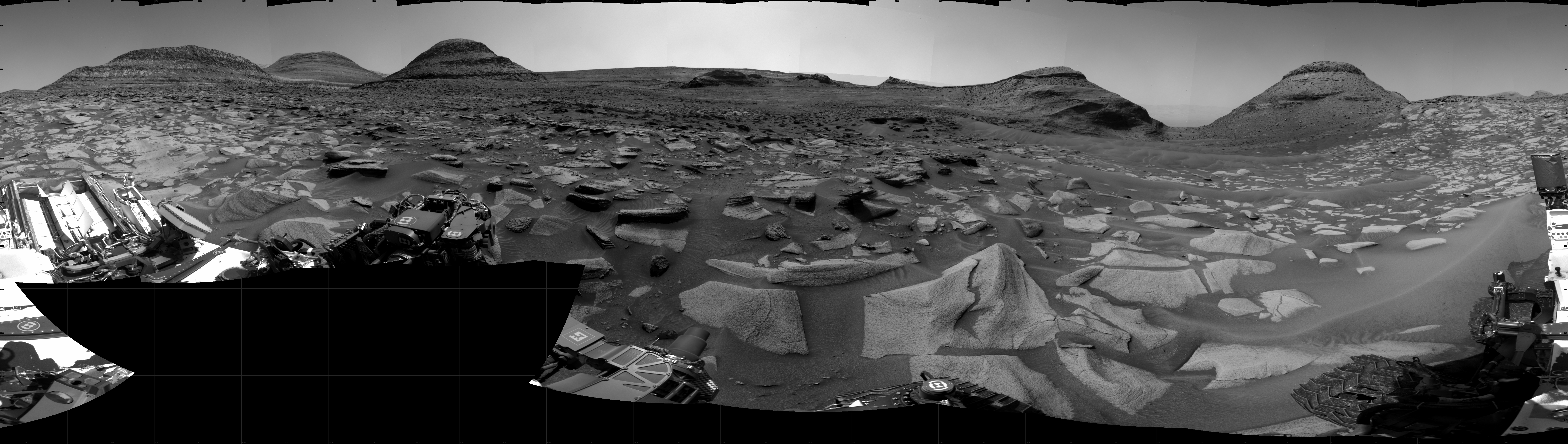 NASA's Mars rover Curiosity took 31 images in Gale Crater using its mast-mounted Right Navigation Camera (Navcam) to create this mosaic. The seam-corrected mosaic provides a 360-degree cylindrical projection panorama of the Martian surface centered at 245 degrees azimuth (measured clockwise from north). Curiosity took the images on September 02, 2022, Sol 3580 of the Mars Science Laboratory mission at drive 1170, site number 97. The local mean solar time for the image exposures was 2 PM. Each Navcam image has a 45 degree field of view. CREDIT: NASA/JPL-Caltech