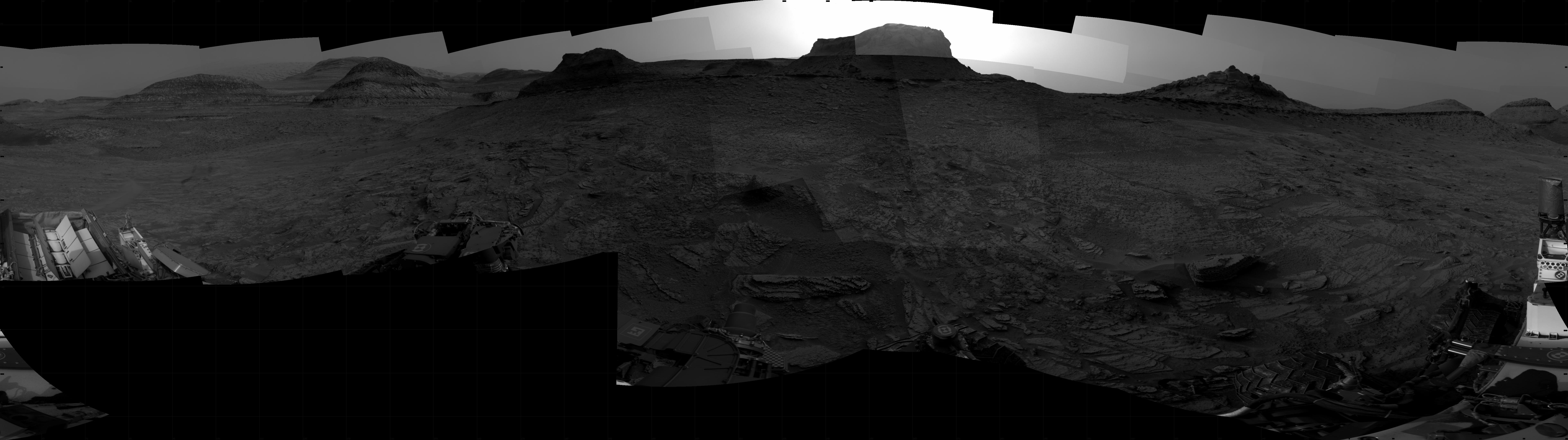 NASA's Mars rover Curiosity took 30 images in Gale Crater using its mast-mounted Right Navigation Camera (Navcam) to create this mosaic. The seam-corrected mosaic provides a 360-degree cylindrical projection panorama of the Martian surface centered at 230 degrees azimuth (measured clockwise from north). Curiosity took the images on October 28, 2022, Sol 3635 of the Mars Science Laboratory mission at drive 3110, site number 97. The local mean solar time for the image exposures was 4 PM. Each Navcam image has a 45 degree field of view. CREDIT: NASA/JPL-Caltech