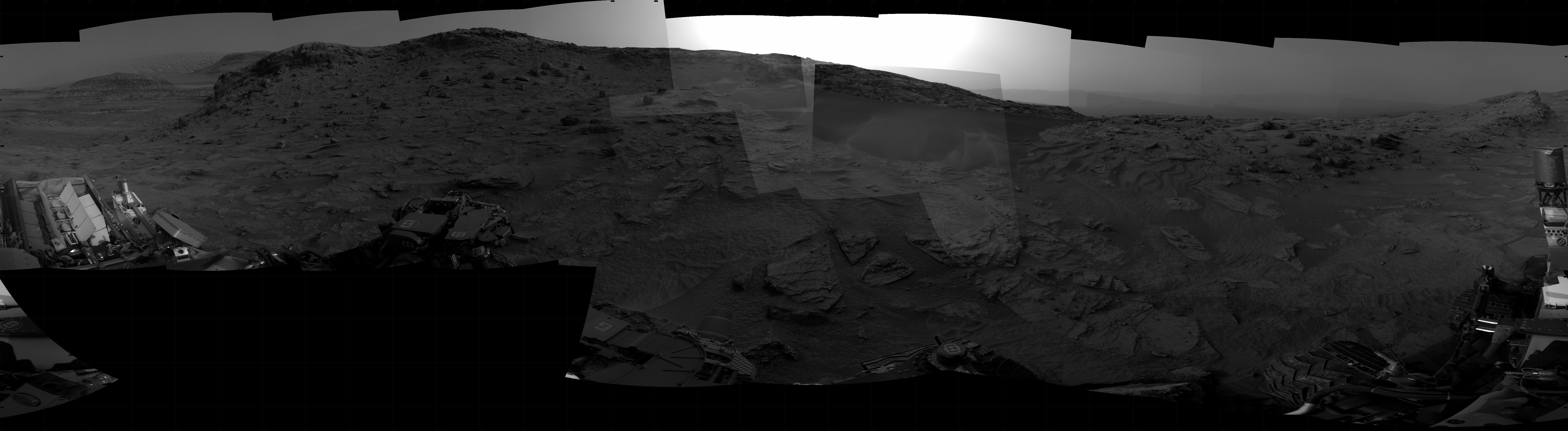 NASA's Mars rover Curiosity took 31 images in Gale Crater using its mast-mounted Right Navigation Camera (Navcam) to create this mosaic. The seam-corrected mosaic provides a 360-degree cylindrical projection panorama of the Martian surface centered at 250 degrees azimuth (measured clockwise from north). Curiosity took the images on November 09, 2022, Sol 3646 of the Mars Science Laboratory mission at drive 800, site number 98. The local mean solar time for the image exposures was 5 PM. Each Navcam image has a 45 degree field of view. CREDIT: NASA/JPL-Caltech