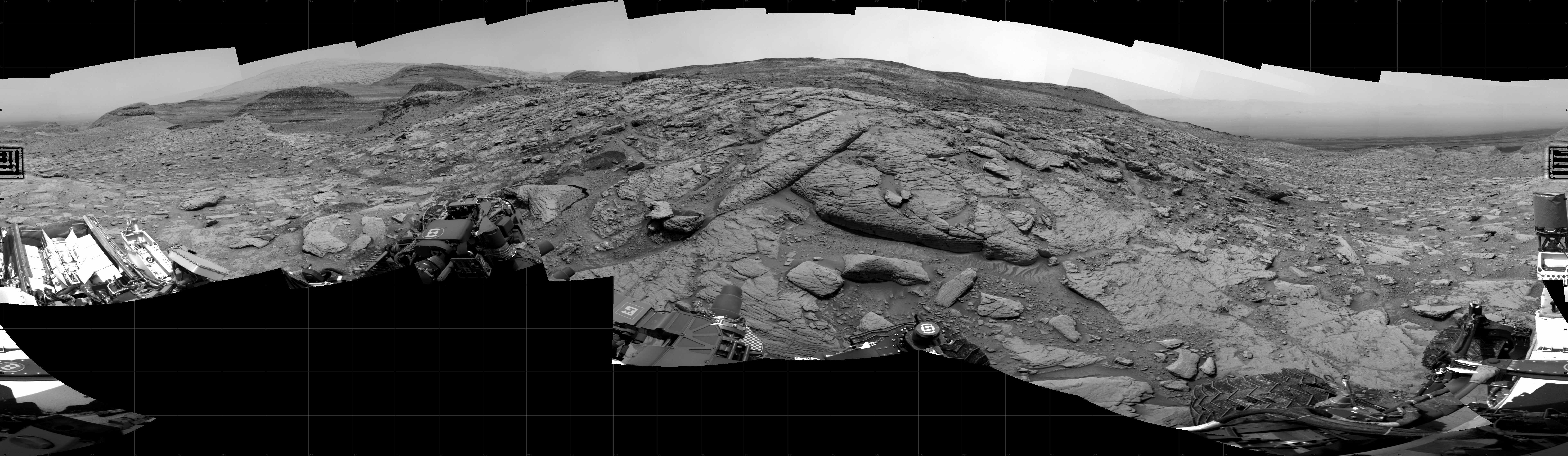 NASA's Mars rover Curiosity took 32 images in Gale Crater using its mast-mounted Right Navigation Camera (Navcam) to create this mosaic. The seam-corrected mosaic provides a 360-degree cylindrical projection panorama of the Martian surface centered at 209 degrees azimuth (measured clockwise from north). Curiosity took the images on November 16, 2022, Sol 3653 of the Mars Science Laboratory mission at drive 1448, site number 98. The local mean solar time for the image exposures was 2 PM. Each Navcam image has a 45 degree field of view. CREDIT: NASA/JPL-Caltech