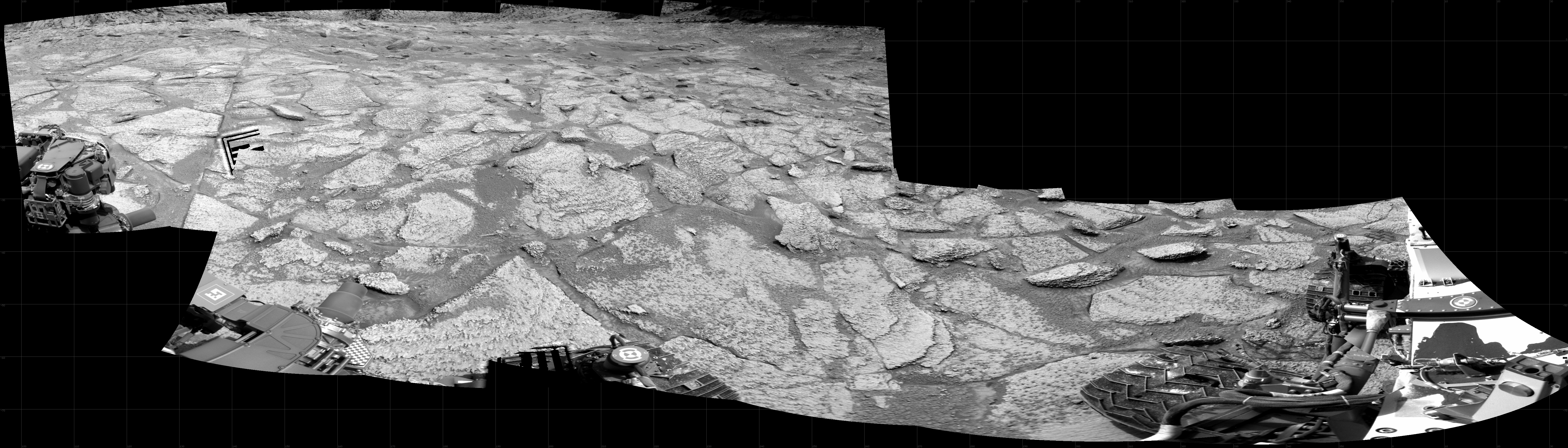 NASA's Mars rover Curiosity took 12 images in Gale Crater using its mast-mounted Right Navigation Camera (Navcam) to create this mosaic. The seam-corrected mosaic provides a 298-degree cylindrical projection panorama of the Martian surface centered at 245 degrees azimuth (measured clockwise from north). Curiosity took the images on January 09, 2023, Sol 3706 of the Mars Science Laboratory mission at drive 1256, site number 99. The local mean solar time for the image exposures was 3 PM. Each Navcam image has a 45 degree field of view. CREDIT: NASA/JPL-Caltech