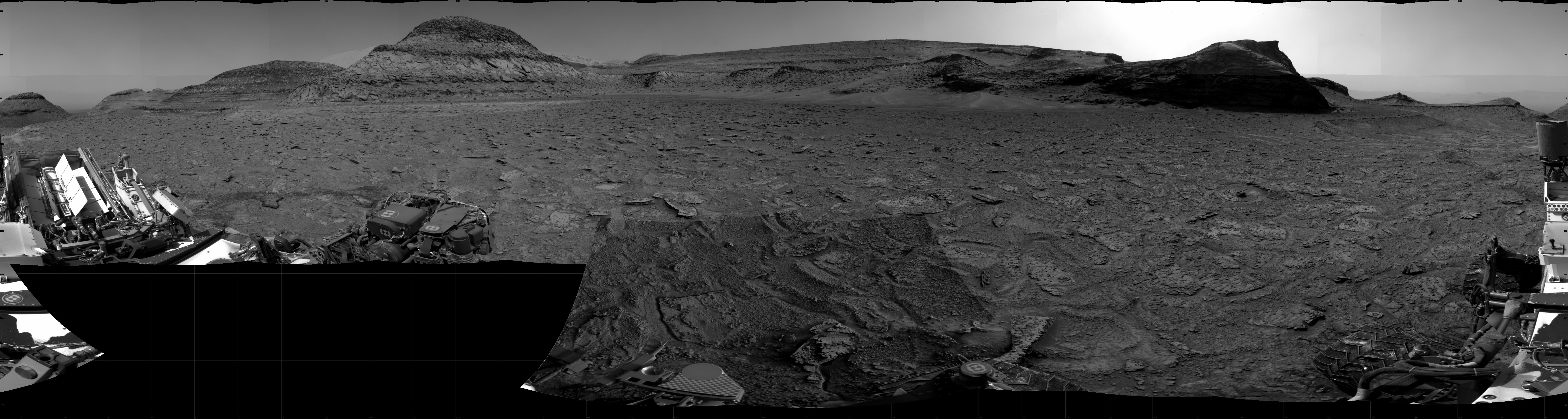 NASA's Mars rover Curiosity took 33 images in Gale Crater using its mast-mounted Right Navigation Camera (Navcam) to create this mosaic. The seam-corrected mosaic provides a 360-degree cylindrical projection panorama of the Martian surface centered at 195 degrees azimuth (measured clockwise from north). Curiosity took the images on January 19, 2023, Sols 3716-3715 of the Mars Science Laboratory mission at drive 1676, site number 99. The local mean solar time for the image exposures was from 4 PM to 6 PM. Each Navcam image has a 45 degree field of view. CREDIT: NASA/JPL-Caltech