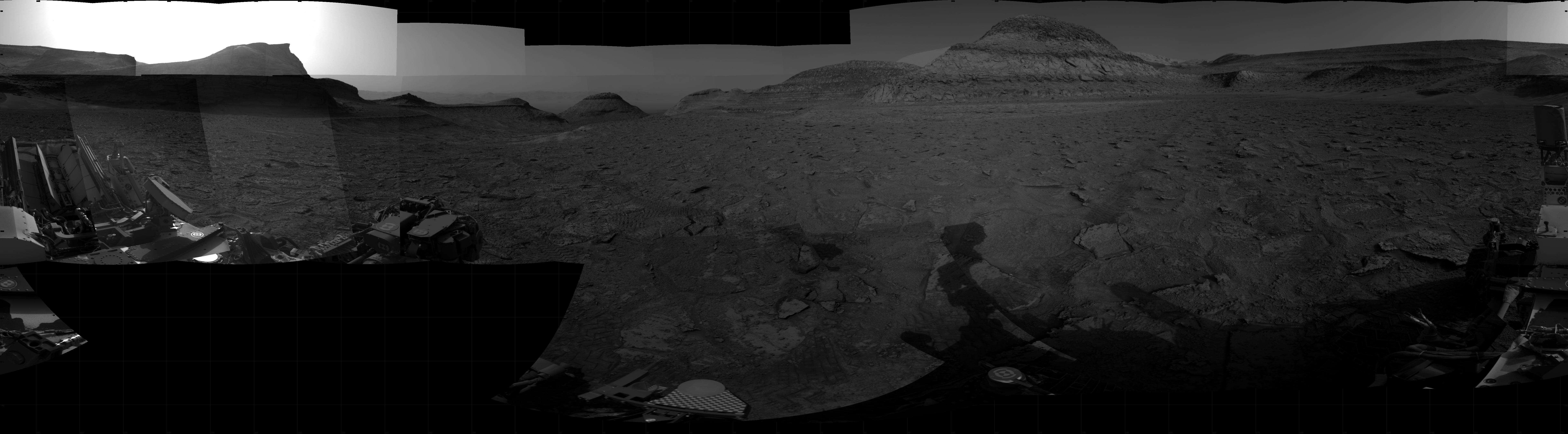 NASA's Mars rover Curiosity took 35 images in Gale Crater using its mast-mounted Right Navigation Camera (Navcam) to create this mosaic. The seam-corrected mosaic provides a 360-degree cylindrical projection panorama of the Martian surface centered at 62 degrees azimuth (measured clockwise from north). Curiosity took the images on February 15, 2023, Sols 3742-3735 of the Mars Science Laboratory mission at drive 84, site number 100. The local mean solar time for the image exposures was from 1 PM to 5 PM. Each Navcam image has a 45 degree field of view. CREDIT: NASA/JPL-Caltech