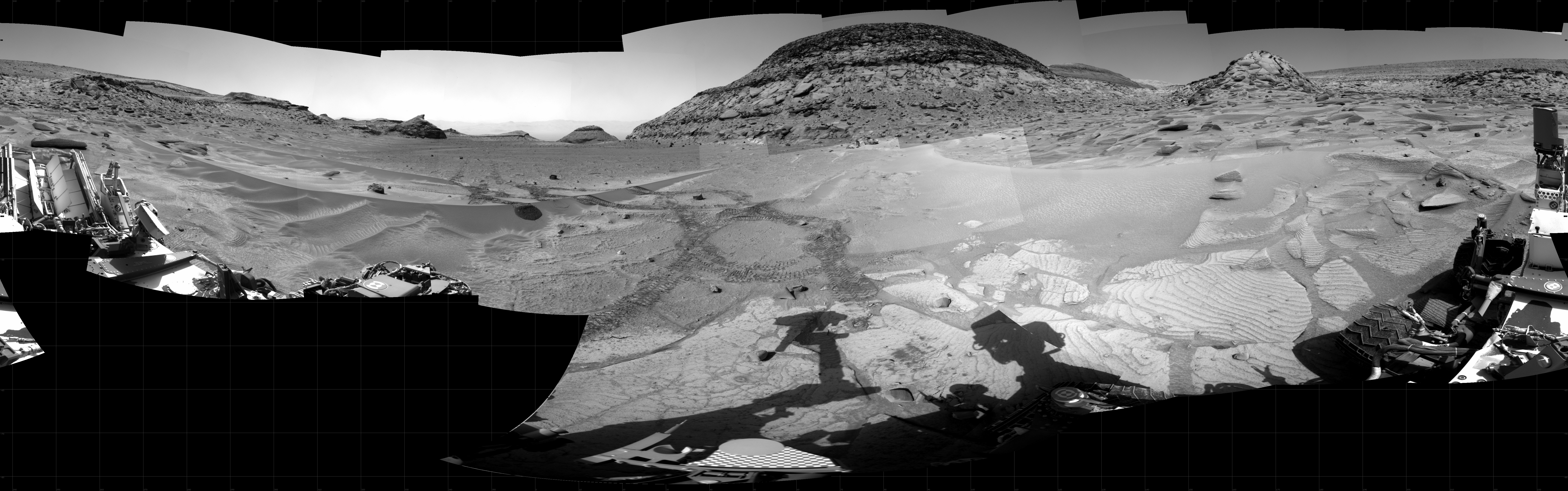 NASA's Mars rover Curiosity took 36 images in Gale Crater using its mast-mounted Right Navigation Camera (Navcam) to create this mosaic. The seam-corrected mosaic provides a 360-degree cylindrical projection panorama of the Martian surface centered at 57 degrees azimuth (measured clockwise from north). Curiosity took the images on February 23, 2023, Sols 3750-3749 of the Mars Science Laboratory mission at drive 1084, site number 100. The local mean solar time for the image exposures was from 1 PM to 3 PM. Each Navcam image has a 45 degree field of view. CREDIT: NASA/JPL-Caltech