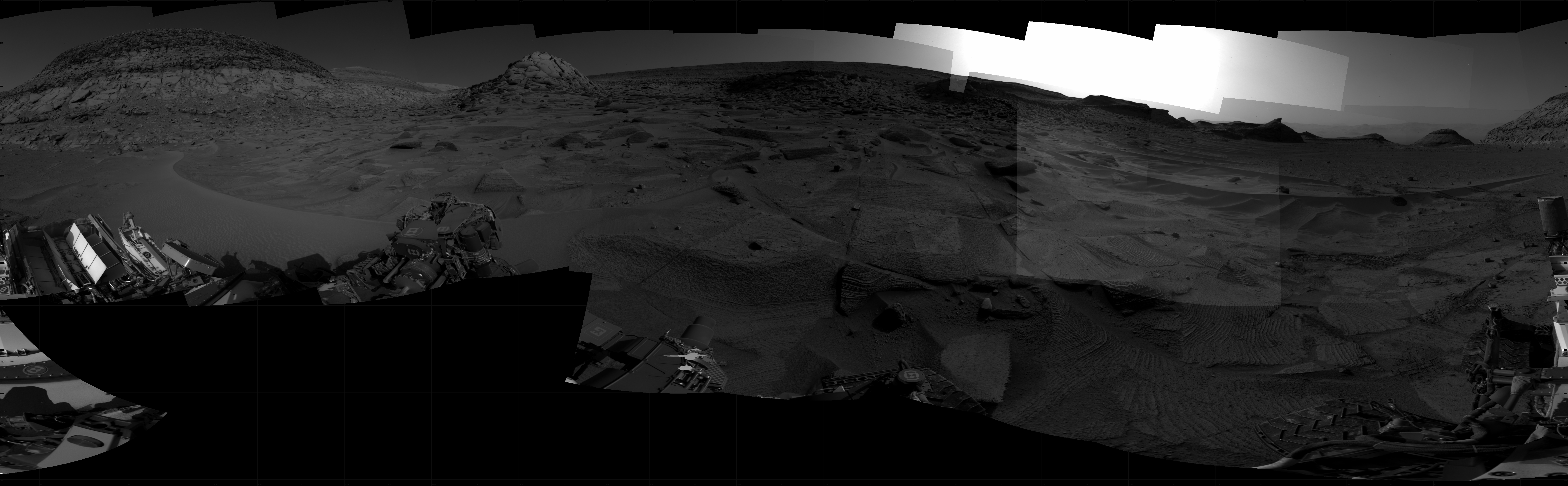 NASA's Mars rover Curiosity took 31 images in Gale Crater using its mast-mounted Right Navigation Camera (Navcam) to create this mosaic. The seam-corrected mosaic provides a 360-degree cylindrical projection panorama of the Martian surface centered at 221 degrees azimuth (measured clockwise from north). Curiosity took the images on March 17, 2023, Sol 3771 of the Mars Science Laboratory mission at drive 1168, site number 100. The local mean solar time for the image exposures was 4 PM. Each Navcam image has a 45 degree field of view. CREDIT: NASA/JPL-Caltech