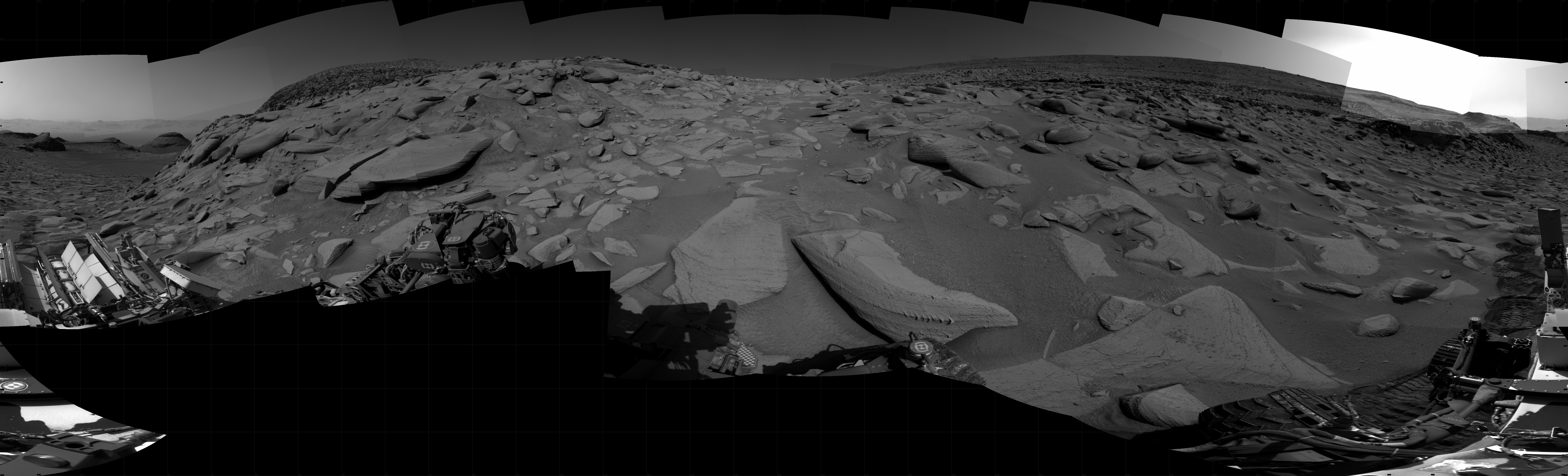 NASA's Mars rover Curiosity took 31 images in Gale Crater using its mast-mounted Right Navigation Camera (Navcam) to create this mosaic. The seam-corrected mosaic provides a 360-degree cylindrical projection panorama of the Martian surface centered at 152 degrees azimuth (measured clockwise from north). Curiosity took the images on April 13, 2023, Sol 3797 of the Mars Science Laboratory mission at drive 2574, site number 100. The local mean solar time for the image exposures was from 2 PM to 3 PM. Each Navcam image has a 45 degree field of view. CREDIT: NASA/JPL-Caltech