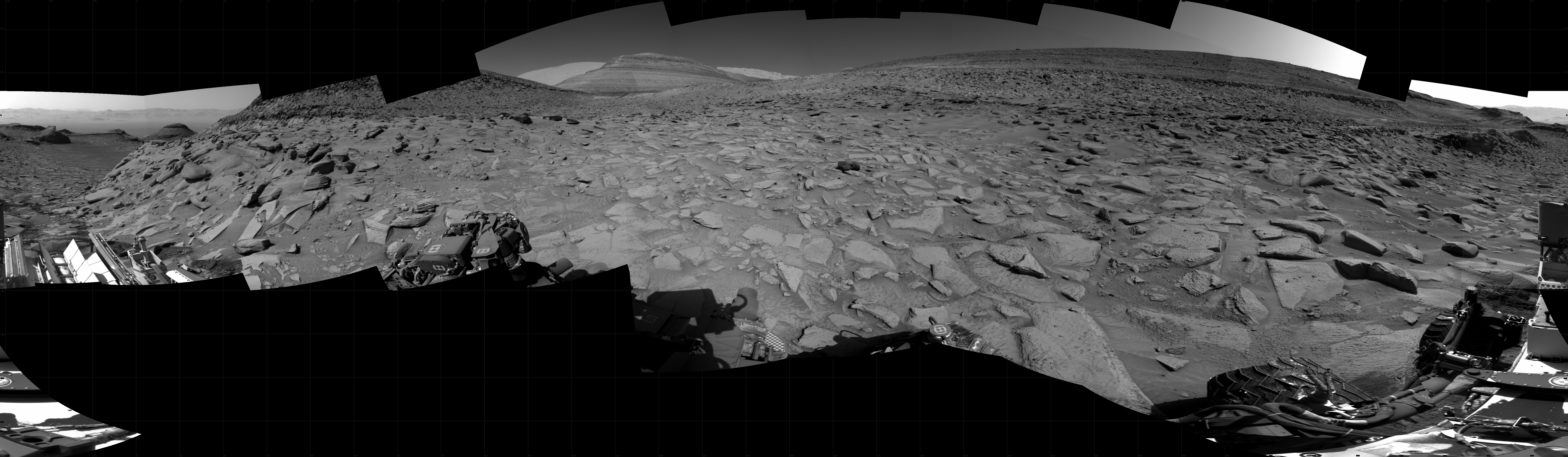 NASA's Mars rover Curiosity took 25 images in Gale Crater using its mast-mounted Right Navigation Camera (Navcam) to create this mosaic. The seam-corrected mosaic provides a 360-degree cylindrical projection panorama of the Martian surface centered at 149 degrees azimuth (measured clockwise from north). Curiosity took the images on April 21, 2023, Sol 3805 of the Mars Science Laboratory mission at drive 198, site number 101. The local mean solar time for the image exposures was from 2 PM to 3 PM. Each Navcam image has a 45 degree field of view. CREDIT: NASA/JPL-Caltech
