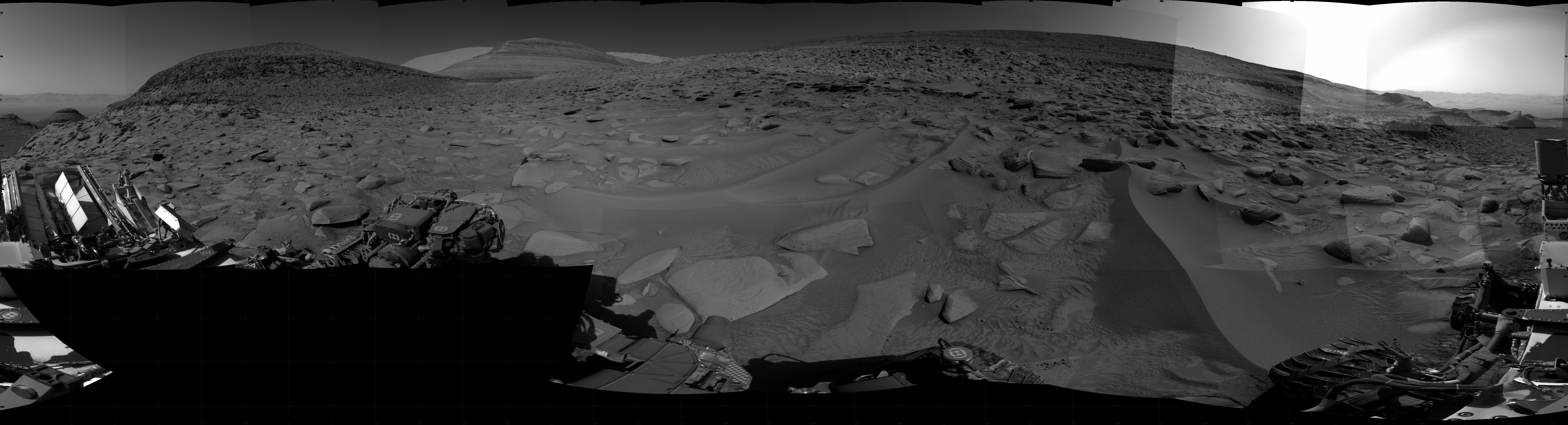 NASA's Mars rover Curiosity took 31 images in Gale Crater using its mast-mounted Right Navigation Camera (Navcam) to create this mosaic. The seam-corrected mosaic provides a 360-degree cylindrical projection panorama of the Martian surface centered at 174 degrees azimuth (measured clockwise from north). Curiosity took the images on April 24, 2023, Sol 3808 of the Mars Science Laboratory mission at drive 324, site number 101. The local mean solar time for the image exposures was from 2 PM to 3 PM. Each Navcam image has a 45 degree field of view. CREDIT: NASA/JPL-Caltech