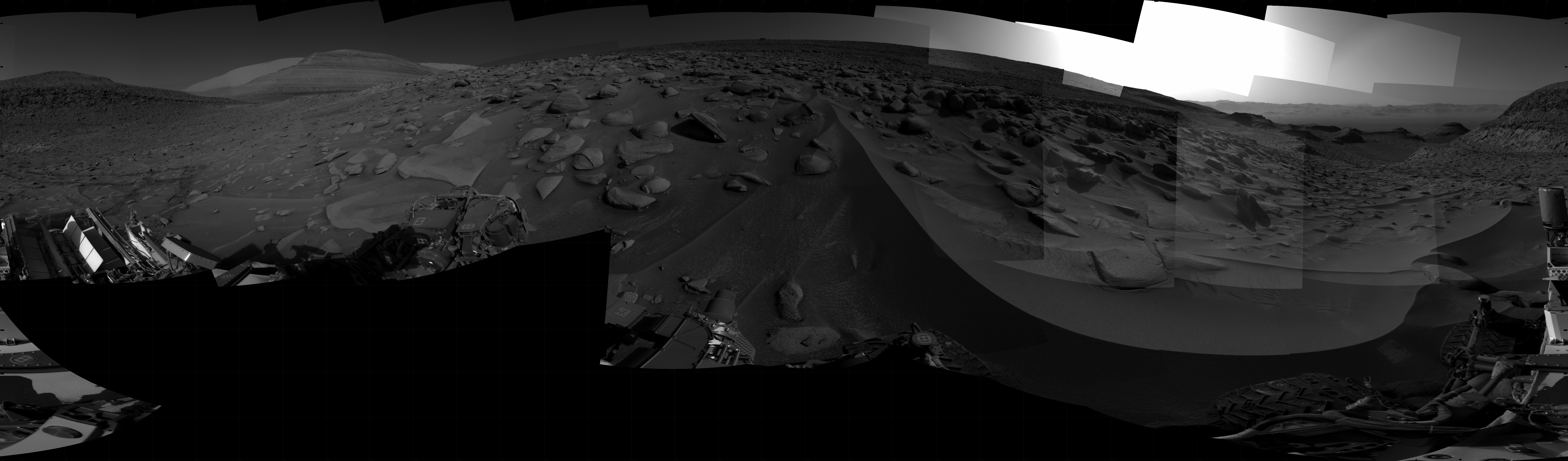 NASA's Mars rover Curiosity took 31 images in Gale Crater using its mast-mounted Right Navigation Camera (Navcam) to create this mosaic. The seam-corrected mosaic provides a 360-degree cylindrical projection panorama of the Martian surface centered at 215 degrees azimuth (measured clockwise from north). Curiosity took the images on May 26, 2023, Sol 3839 of the Mars Science Laboratory mission at drive 1138, site number 101. The local mean solar time for the image exposures was from 3 PM to 4 PM. Each Navcam image has a 45 degree field of view. CREDIT: NASA/JPL-Caltech