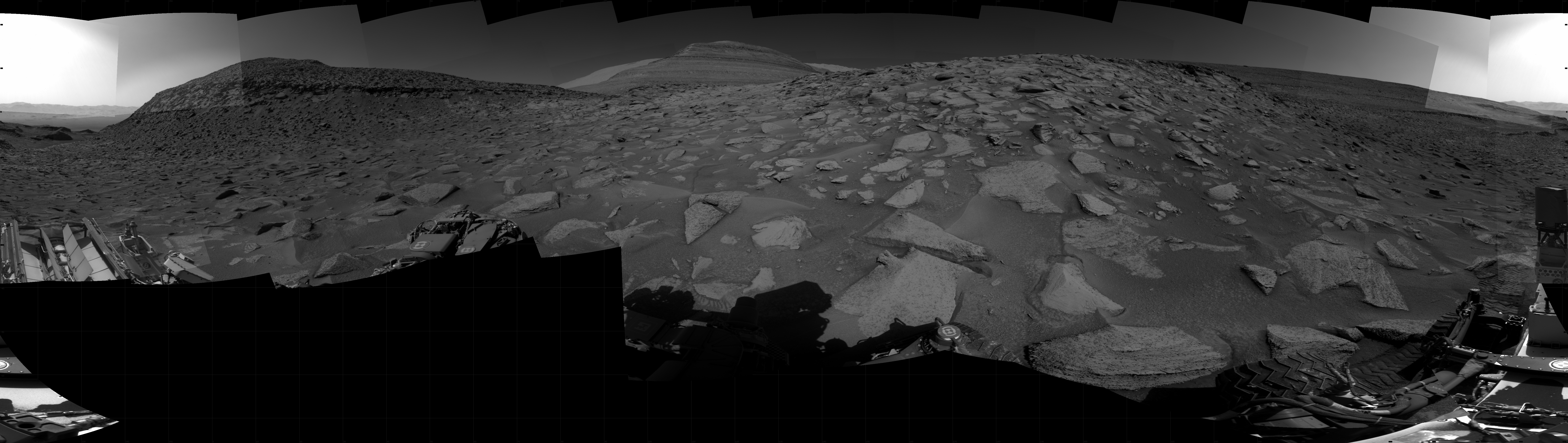 NASA's Mars rover Curiosity took 31 images in Gale Crater using its mast-mounted Right Navigation Camera (Navcam) to create this mosaic. The seam-corrected mosaic provides a 360-degree cylindrical projection panorama of the Martian surface centered at 131 degrees azimuth (measured clockwise from north). Curiosity took the images on June 27, 2023, Sol 3870 of the Mars Science Laboratory mission at drive 0, site number 102. The local mean solar time for the image exposures was 2 PM. Each Navcam image has a 45 degree field of view. CREDIT: NASA/JPL-Caltech