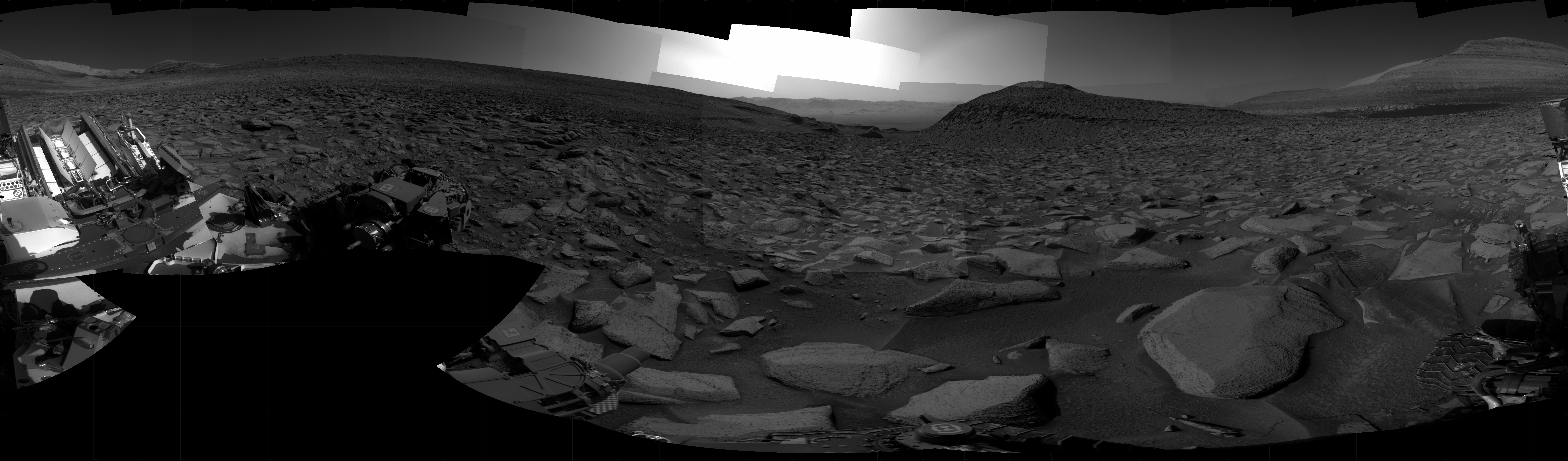NASA's Mars rover Curiosity took 31 images in Gale Crater using its mast-mounted Right Navigation Camera (Navcam) to create this mosaic. The seam-corrected mosaic provides a 360-degree cylindrical projection panorama of the Martian surface centered at 309 degrees azimuth (measured clockwise from north). Curiosity took the images on July 12, 2023, Sol 3885 of the Mars Science Laboratory mission at drive 1054, site number 102. The local mean solar time for the image exposures was from 2 PM to 3 PM. Each Navcam image has a 45 degree field of view. CREDIT: NASA/JPL-Caltech