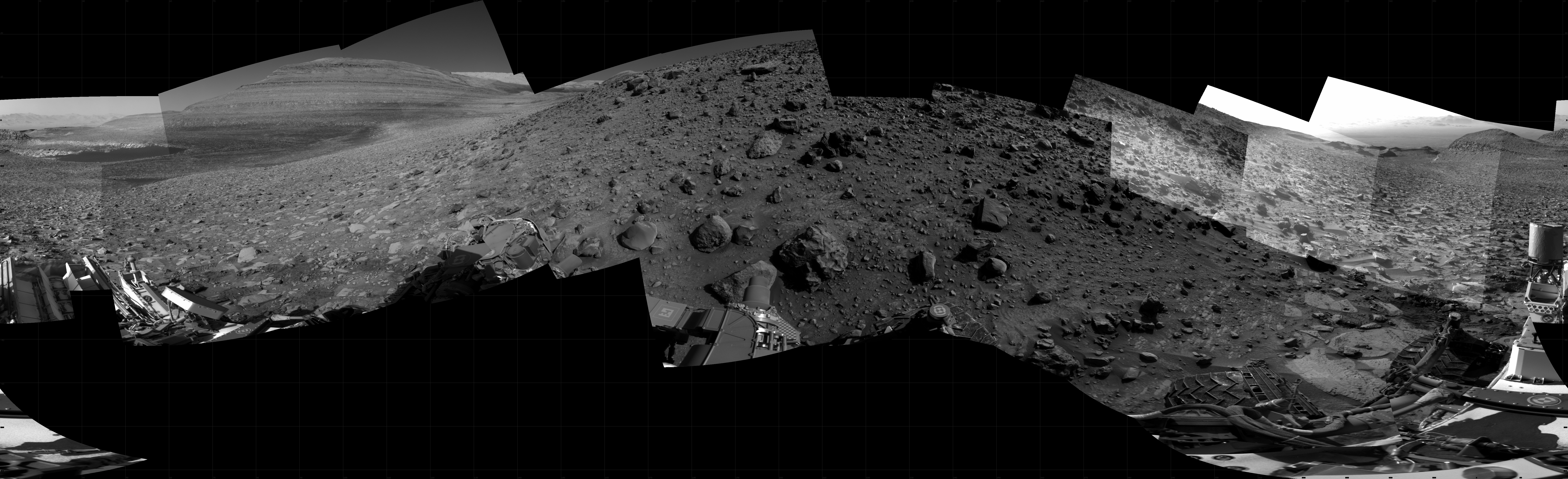 NASA's Mars rover Curiosity took 21 images in Gale Crater using its mast-mounted Right Navigation Camera (Navcam) to create this mosaic. The seam-corrected mosaic provides a 360-degree cylindrical projection panorama of the Martian surface centered at 201 degrees azimuth (measured clockwise from north). Curiosity took the images on August 25, 2023, Sol 3928 of the Mars Science Laboratory mission at drive 1742, site number 103. The local mean solar time for the image exposures was from 2 PM to 4 PM. Each Navcam image has a 45 degree field of view. CREDIT: NASA/JPL-Caltech