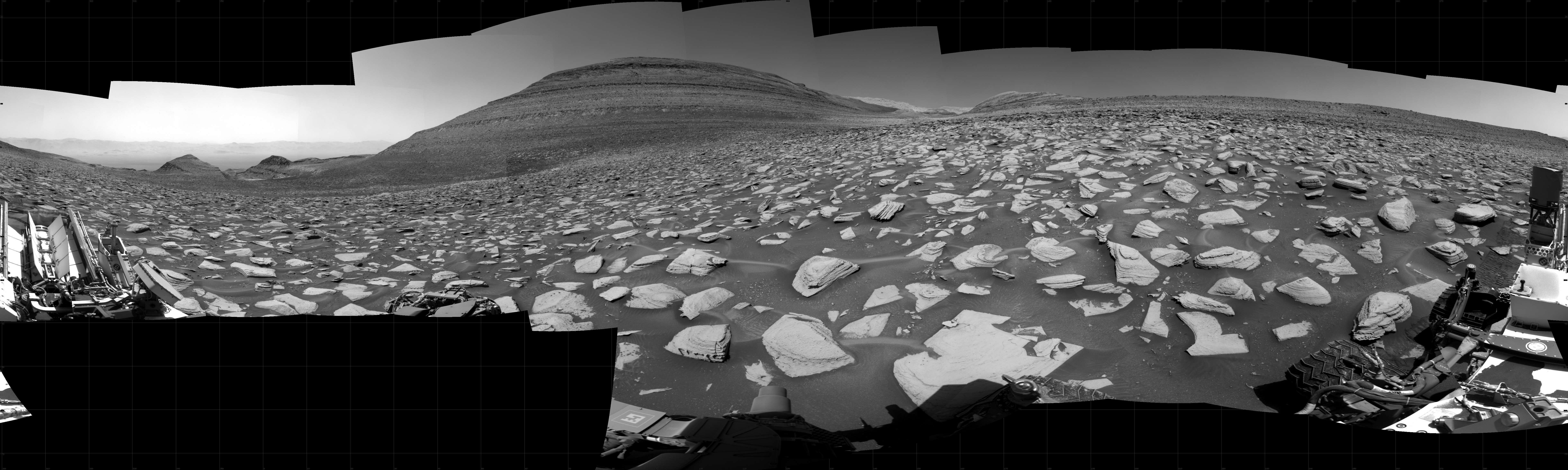 NASA's Mars rover Curiosity took 31 images in Gale Crater using its mast-mounted Right Navigation Camera (Navcam) to create this mosaic. The seam-corrected mosaic provides a 360-degree cylindrical projection panorama of the Martian surface centered at 120 degrees azimuth (measured clockwise from north). Curiosity took the images on September 18, 2023, Sol 3951 of the Mars Science Laboratory mission at drive 856, site number 104. The local mean solar time for the image exposures was 12 PM. Each Navcam image has a 45 degree field of view. CREDIT: NASA/JPL-Caltech