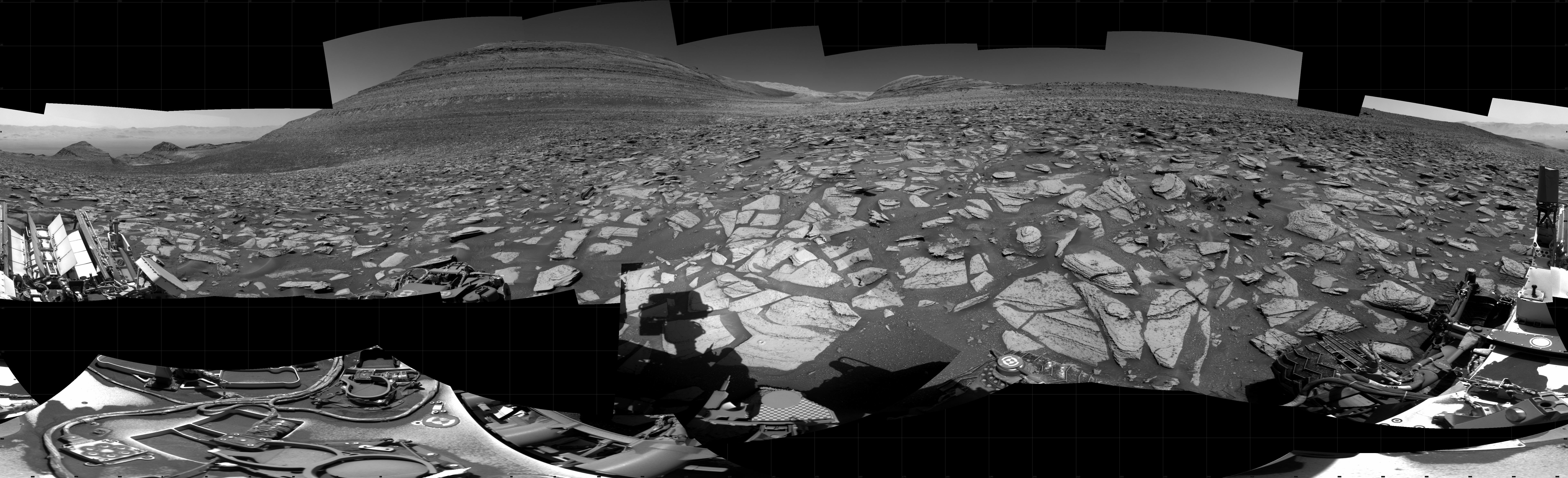 NASA's Mars rover Curiosity took 35 images in Gale Crater using its mast-mounted Right Navigation Camera (Navcam) to create this mosaic. The seam-corrected mosaic provides a 360-degree cylindrical projection panorama of the Martian surface centered at 143 degrees azimuth (measured clockwise from north). Curiosity took the images on October 20, 2023, Sols 3982-3974 of the Mars Science Laboratory mission at drive 418, site number 105. The local mean solar time for the image exposures was from 11 AM to 1 PM. Each Navcam image has a 45 degree field of view. CREDIT: NASA/JPL-Caltech