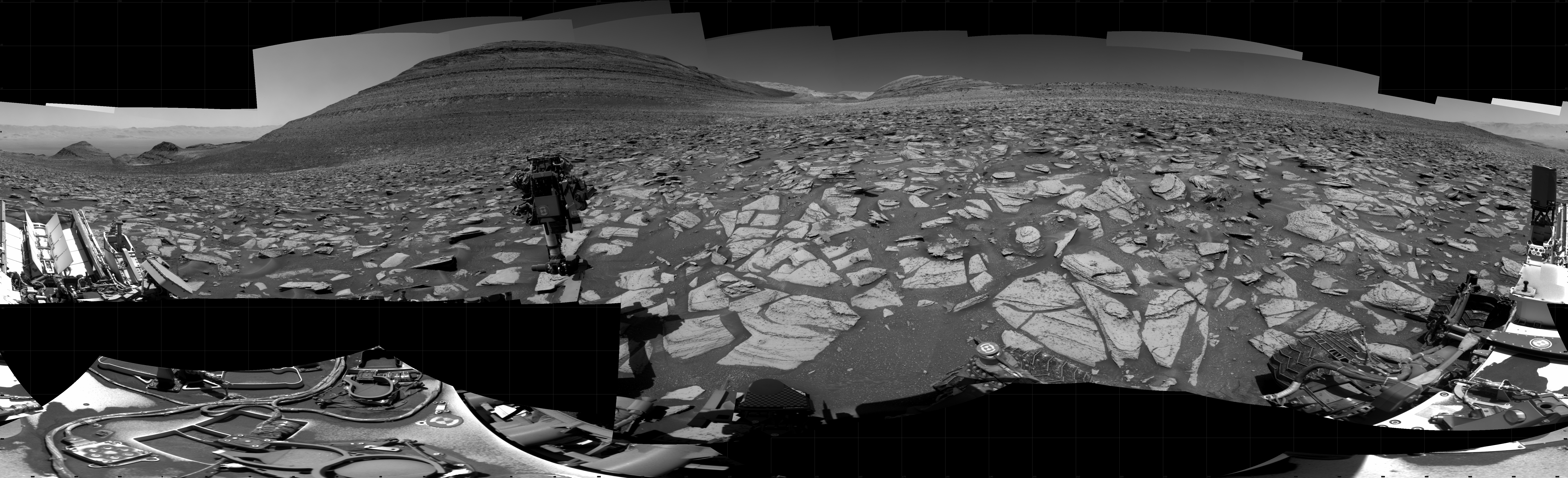 NASA's Mars rover Curiosity took 63 images in Gale Crater using its mast-mounted Right Navigation Camera (Navcam) to create this mosaic. The seam-corrected mosaic provides a 360-degree cylindrical projection panorama of the Martian surface centered at 143 degrees azimuth (measured clockwise from north). Curiosity took the images on October 22, 2023, Sols 3984-3974 of the Mars Science Laboratory mission at drive 418, site number 105. The local mean solar time for the image exposures was from 11 AM to 1 PM. Each Navcam image has a 45 degree field of view. CREDIT: NASA/JPL-Caltech