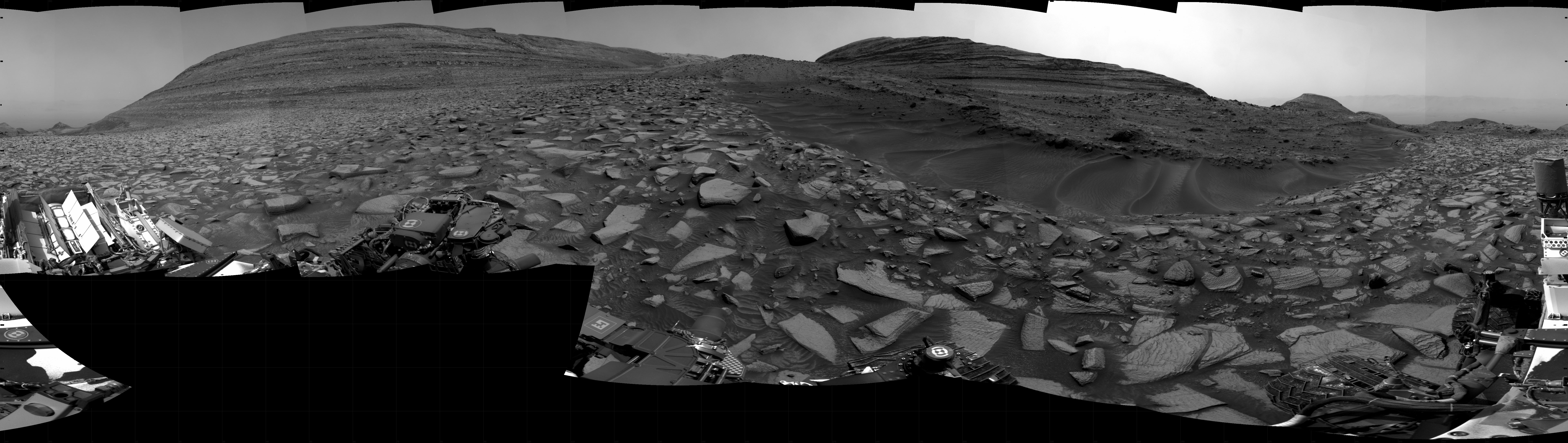 NASA's Mars rover Curiosity took 31 images in Gale Crater using its mast-mounted Right Navigation Camera (Navcam) to create this mosaic. The seam-corrected mosaic provides a 360-degree cylindrical projection panorama of the Martian surface centered at 159 degrees azimuth (measured clockwise from north). Curiosity took the images on April 14, 2024, Sol 4155 of the Mars Science Laboratory mission at drive 2386, site number 106. The local mean solar time for the image exposures was 1 PM. Each Navcam image has a 45 degree field of view.
