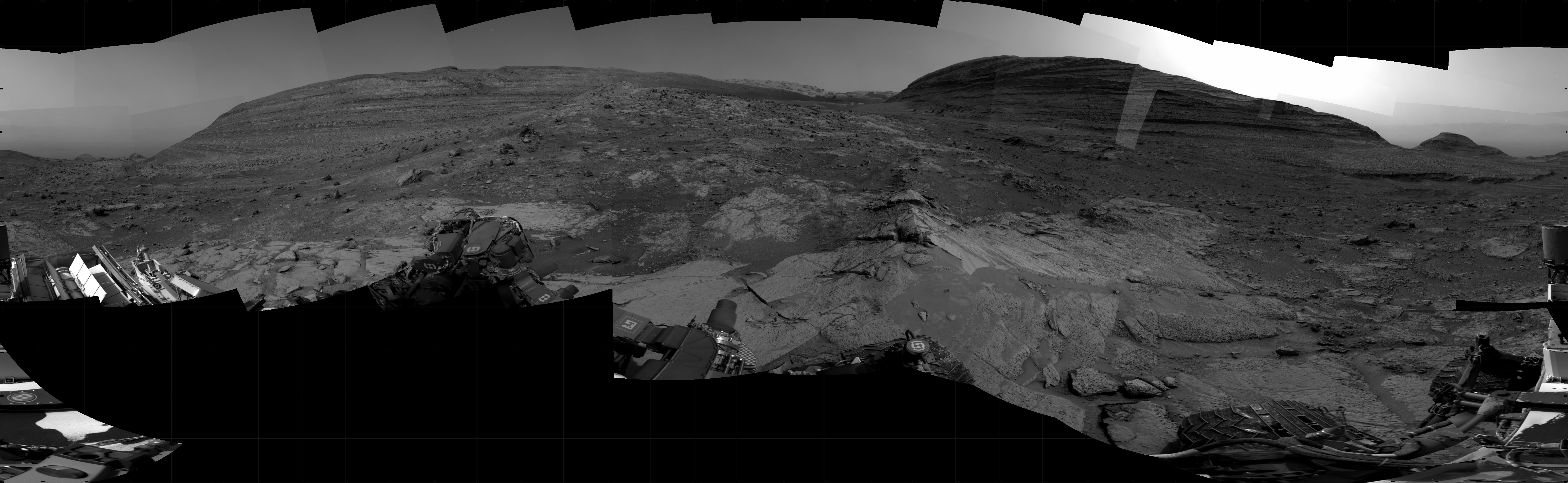 NASA's Mars rover Curiosity took 31 images in Gale Crater using its mast-mounted Right Navigation Camera (Navcam) to create this mosaic. The seam-corrected mosaic provides a 360-degree cylindrical projection panorama of the Martian surface centered at 141 degrees azimuth (measured clockwise from north). Curiosity took the images on August 30, 2024, Sol 4289 of the Mars Science Laboratory mission at drive 1384, site number 108. The local mean solar time for the image exposures was from 3 PM to 4 PM. Each Navcam image has a 45 degree field of view.