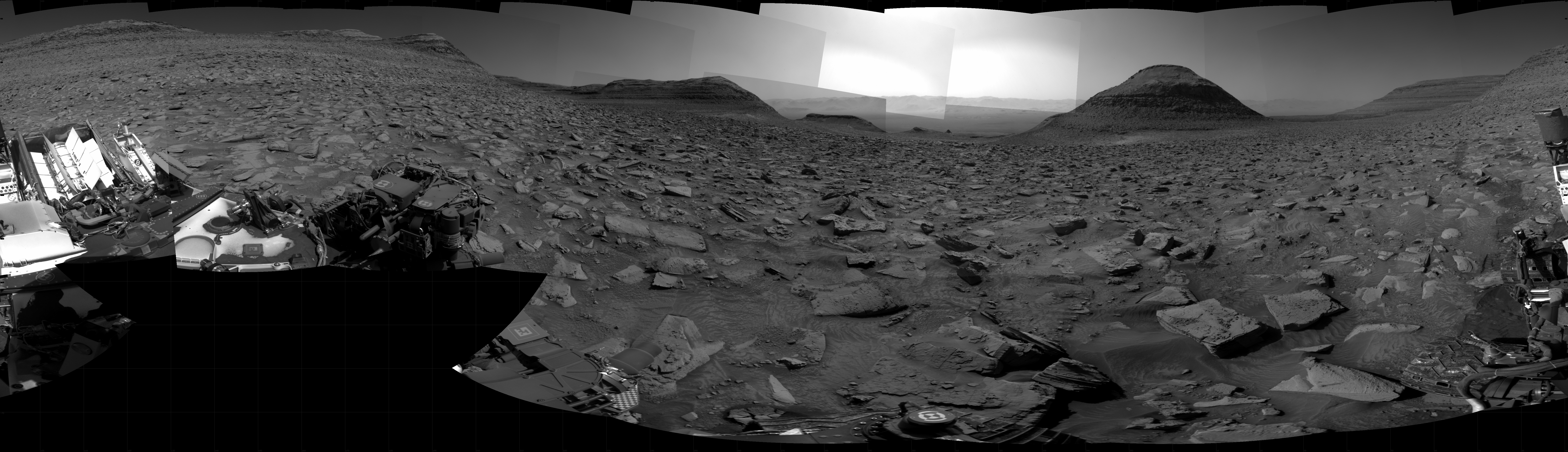 NASA's Mars rover Curiosity took 31 images in Gale Crater using its mast-mounted Right Navigation Camera (Navcam) to create this mosaic. The seam-corrected mosaic provides a 360-degree cylindrical projection panorama of the Martian surface centered at 271 degrees azimuth (measured clockwise from north). Curiosity took the images on February 05, 2025, Sol 4444 of the Mars Science Laboratory mission at drive 0, site number 113. The local mean solar time for the image exposures was from 2 PM to 3 PM. Each Navcam image has a 45 degree field of view.