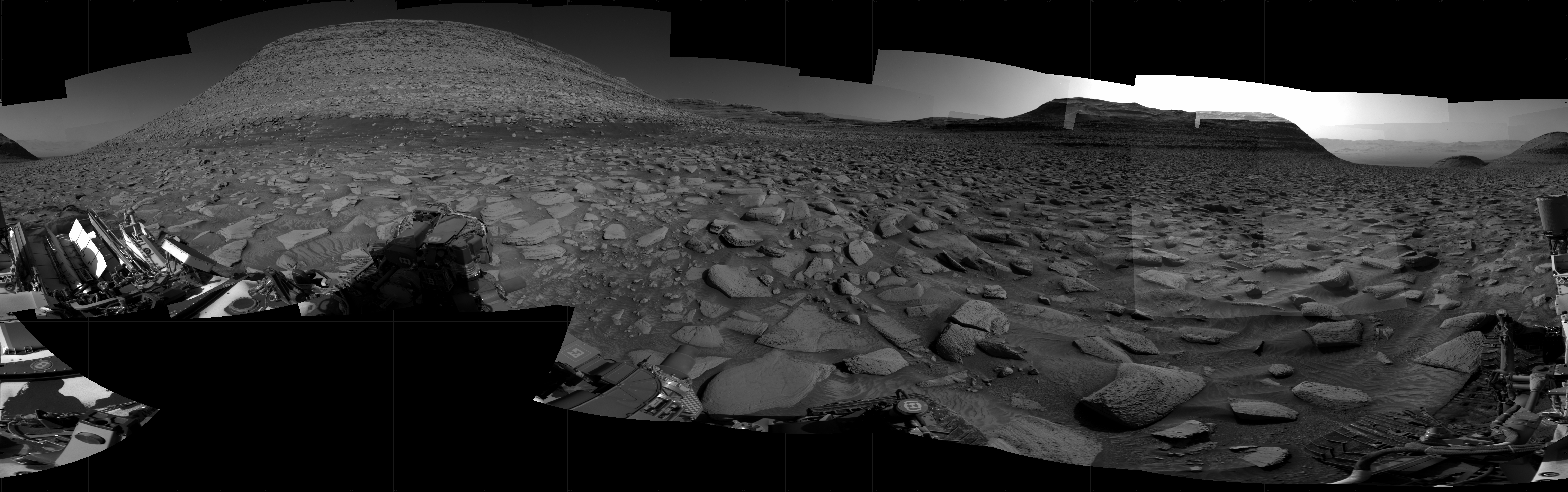 A grayscale panorama of the Martian surface, possibly at night or in twilight, shows a wide field of flat, dark gray terrain dotted with flat, angular, medium-sized rocks stretching into the distance, where a pair of gently sloped, flat-topped buttes rise from the ground on the horizon. Behind the one at the right, a bright light behind it illuminates part of the sky, while the rest of the scene is fairly dark. Portions of the Curiosity rover are visible along the bottom of the image, including a wheel at the bottom center of the frame, and two others in the lower-right corner.