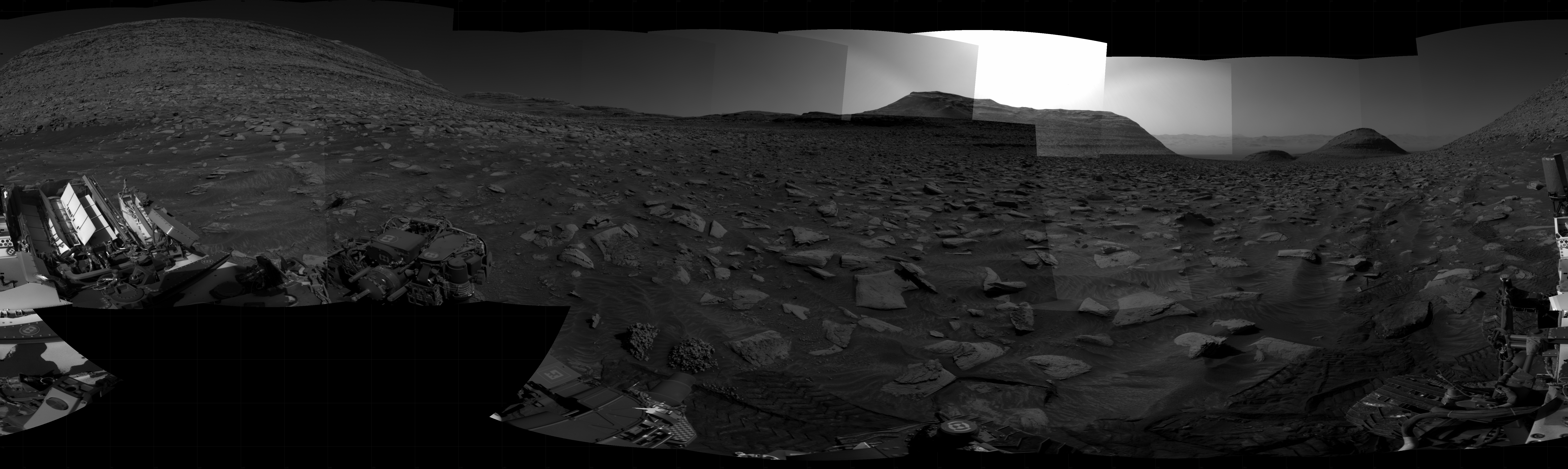 NASA's Mars rover Curiosity took 31 images in Gale Crater using its mast-mounted Right Navigation Camera (Navcam) to create this mosaic. The seam-corrected mosaic provides a 360-degree cylindrical projection panorama of the Martian surface centered at 245 degrees azimuth (measured clockwise from north). Curiosity took the images on March 12, 2025, Sol 4478 of the Mars Science Laboratory mission at drive 366, site number 114. The local mean solar time for the image exposures was from 2 PM to 3 PM. Each Navcam image has a 45 degree field of view.