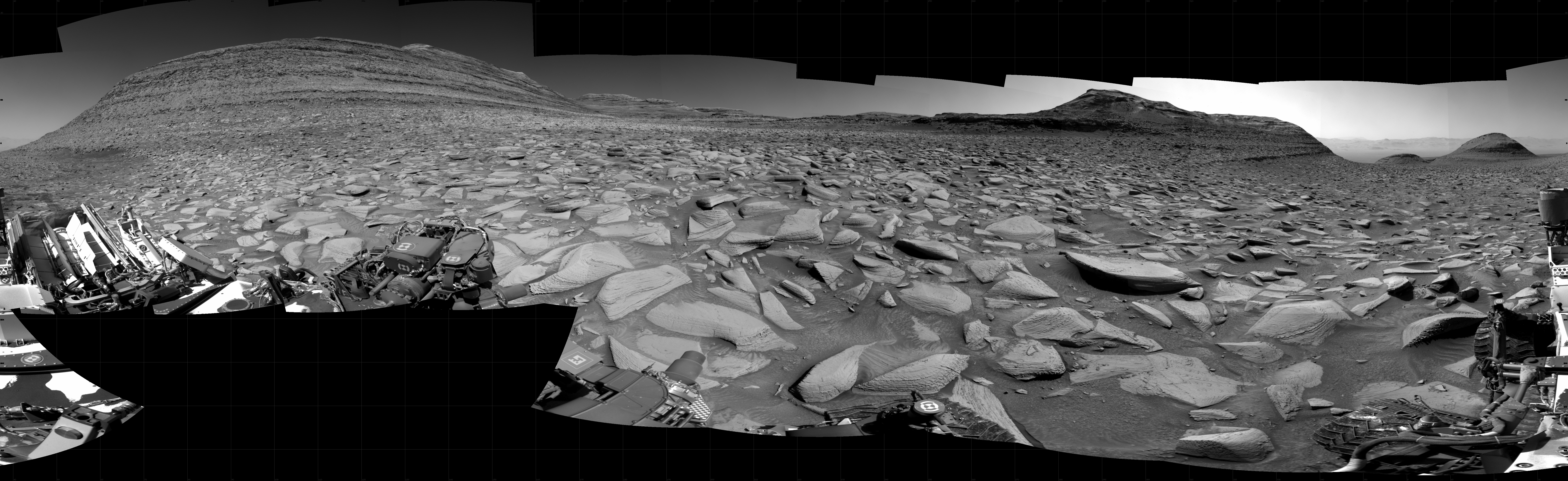 NASA's Mars rover Curiosity took 31 images in Gale Crater using its mast-mounted Right Navigation Camera (Navcam) to create this mosaic. The seam-corrected mosaic provides a 360-degree cylindrical projection panorama of the Martian surface centered at 217 degrees azimuth (measured clockwise from north). Curiosity took the images on March 17, 2025, Sol 4483 of the Mars Science Laboratory mission at drive 780, site number 114. The local mean solar time for the image exposures was 2 PM. Each Navcam image has a 45 degree field of view.