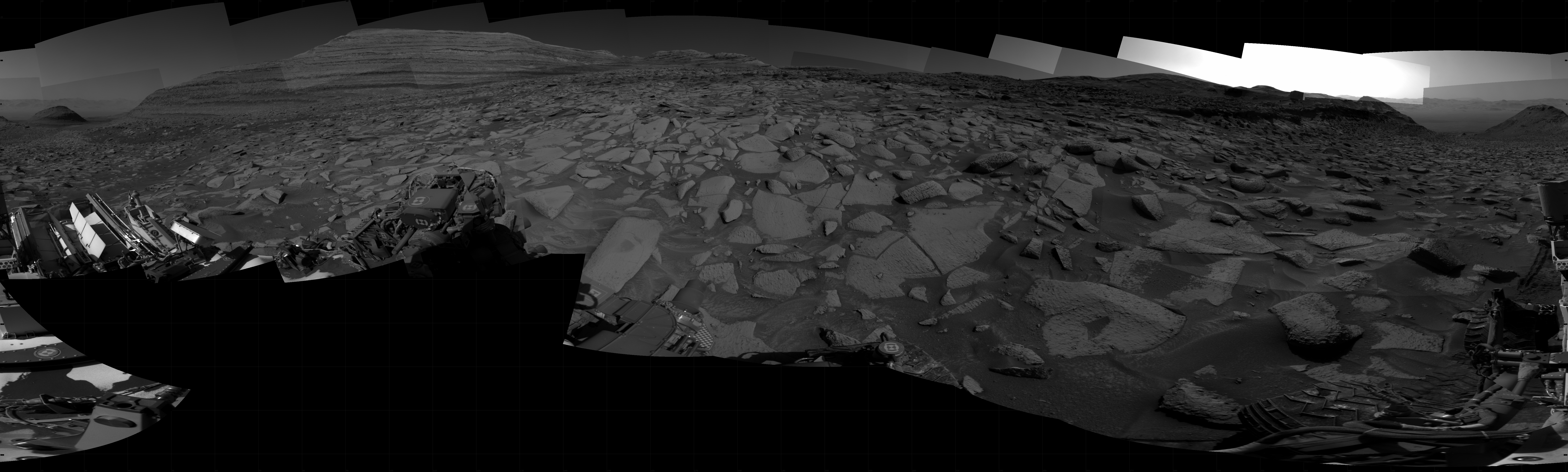 NASA's Mars rover Curiosity took 31 images in Gale Crater using its mast-mounted Right Navigation Camera (Navcam) to create this mosaic. The seam-corrected mosaic provides a 360-degree cylindrical projection panorama of the Martian surface centered at 191 degrees azimuth (measured clockwise from north). Curiosity took the images on April 18, 2025, Sol 4514 of the Mars Science Laboratory mission at drive 1320, site number 115. The local mean solar time for the image exposures was from 2 PM to 3 PM. Each Navcam image has a 45 degree field of view.