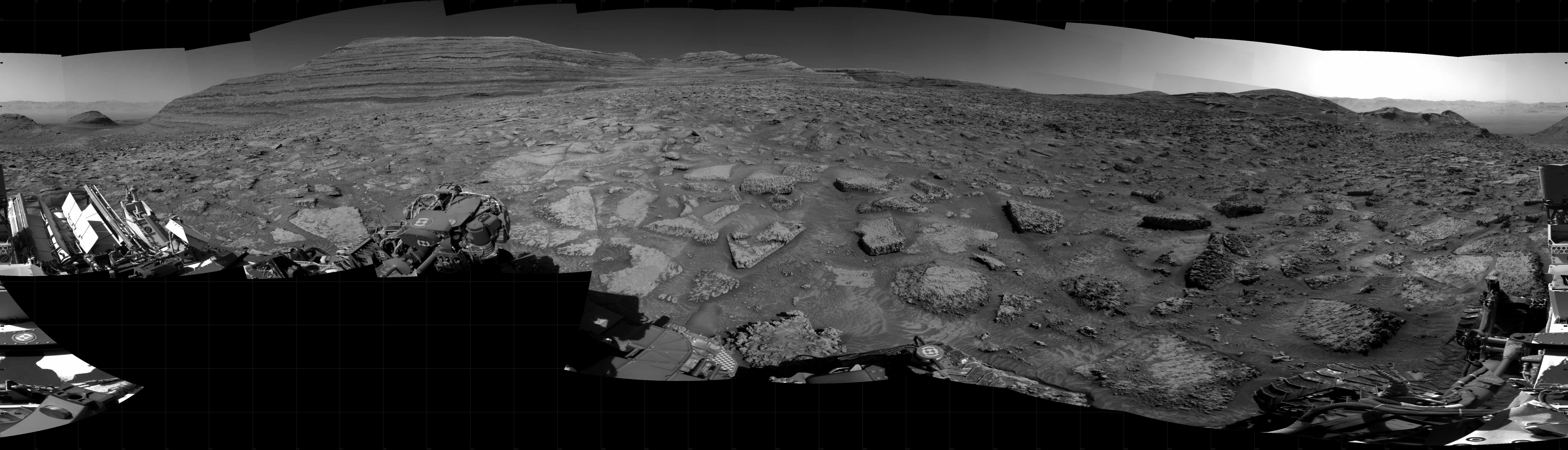 NASA's Mars rover Curiosity took 31 images in Gale Crater using its mast-mounted Right Navigation Camera (Navcam) to create this mosaic. The seam-corrected mosaic provides a 360-degree cylindrical projection panorama of the Martian surface centered at 182 degrees azimuth (measured clockwise from north). Curiosity took the images on May 01, 2025, Sol 4526 of the Mars Science Laboratory mission at drive 1980, site number 115. The local mean solar time for the image exposures was 2 PM. Each Navcam image has a 45 degree field of view.