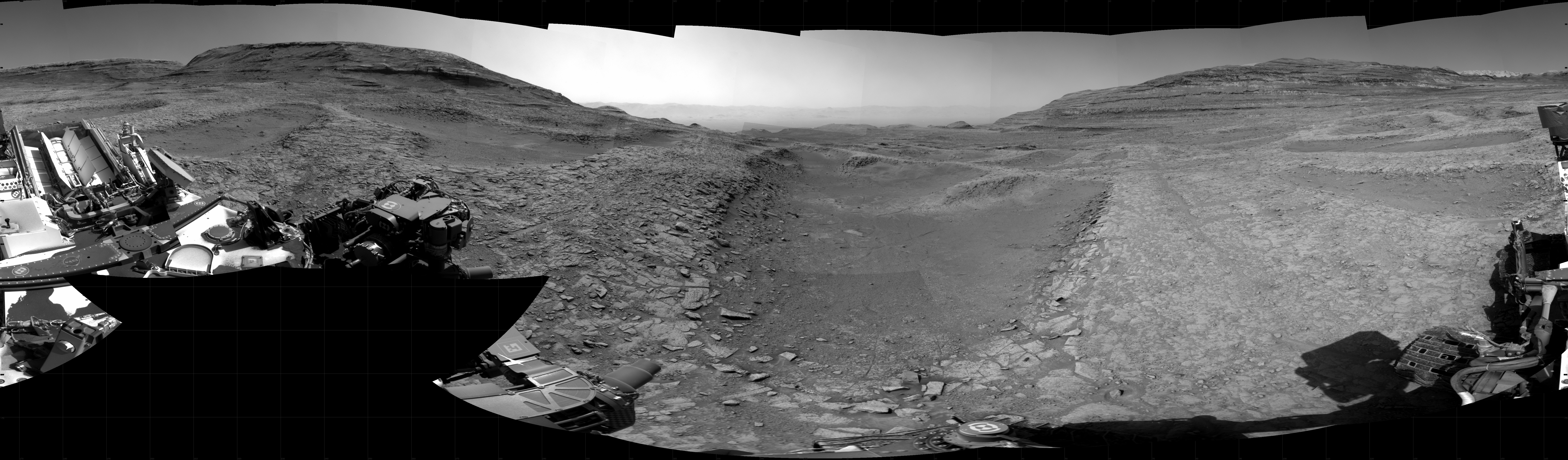 NASA's Mars rover Curiosity took 31 images in Gale Crater using its mast-mounted Right Navigation Camera (Navcam) to create this mosaic. The seam-corrected mosaic provides a 360-degree cylindrical projection panorama of the Martian surface centered at 346 degrees azimuth (measured clockwise from north). Curiosity took the images on October 10, 2025, Sol 4684 of the Mars Science Laboratory mission at drive 1554, site number 119. The local mean solar time for the image exposures was 1 PM. Each Navcam image has a 45 degree field of view.