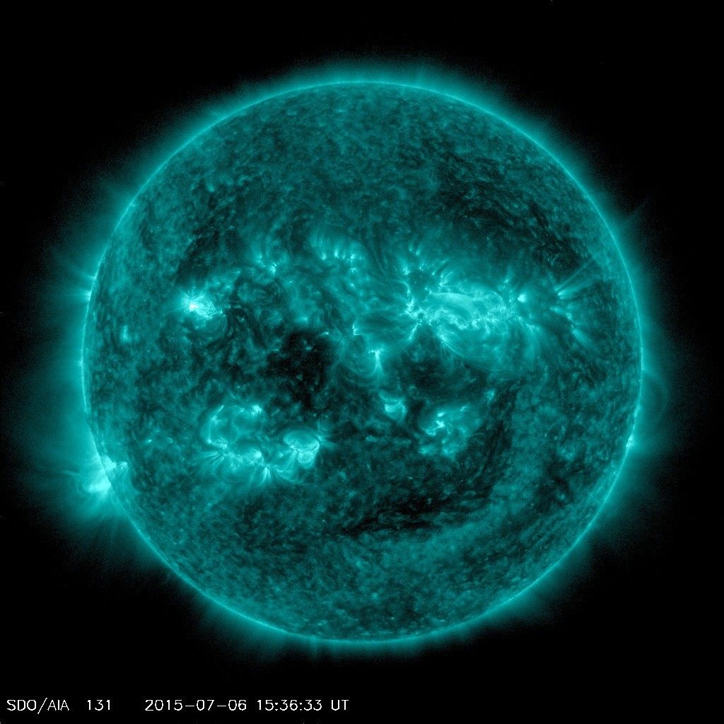 An eruption from the surface of the sun is conspicuous in the lower left portion of this July 6, 2015, image from NASA's Earth-orbiting Solar Dynamics Observatory (SDO). It originates from a location on the surface where NASA's Curiosity Mars rover had been tracking a sunspot in late June and early July.