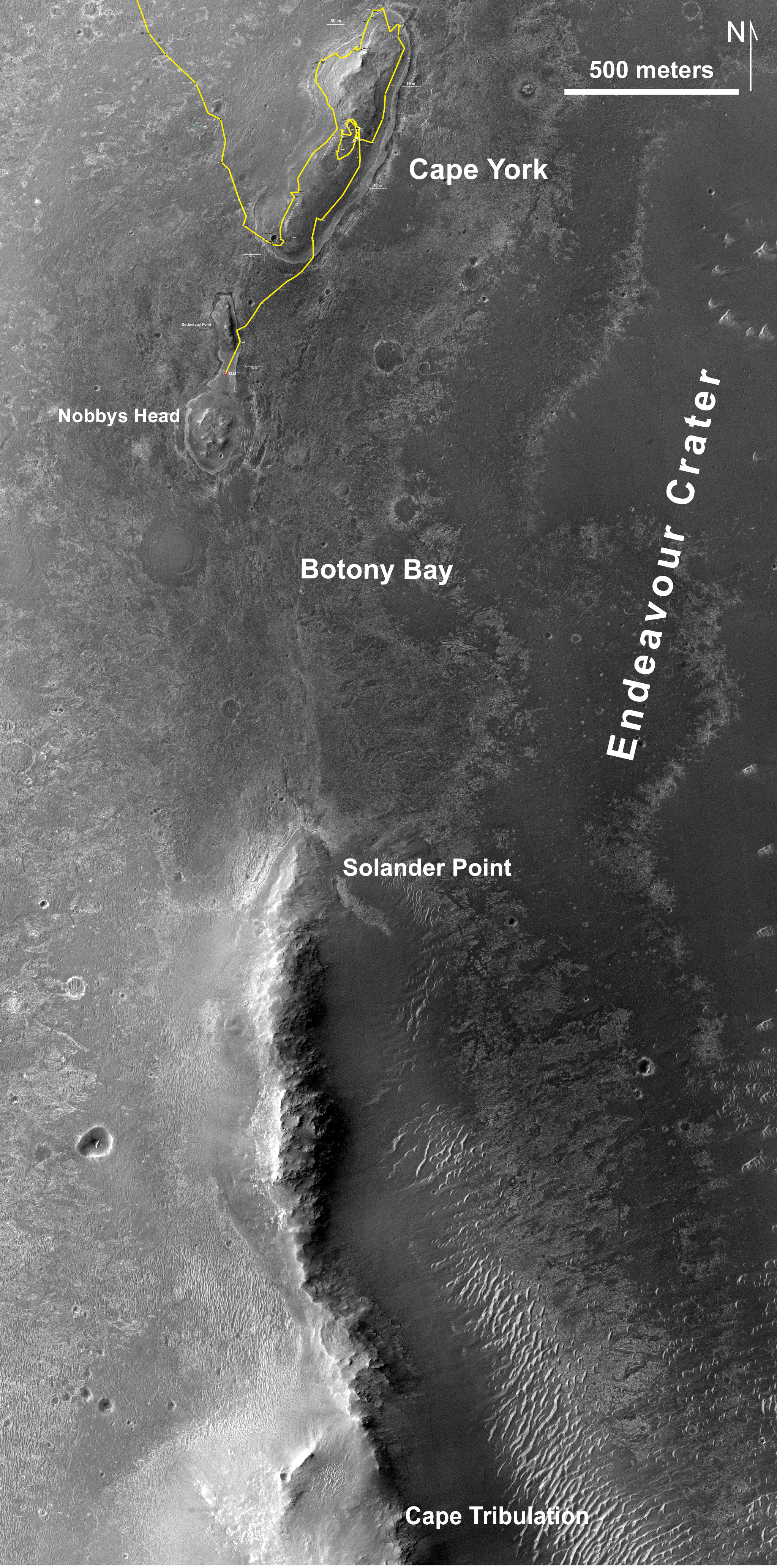 This map of a portion of the western rim of Endeavour Crater on Mars shows the path of NASA's Mars Exploration Rover Opportunity as the rover is driving from the "Cape York" segment of the rim to its next destination, the "Solander Point" segment.