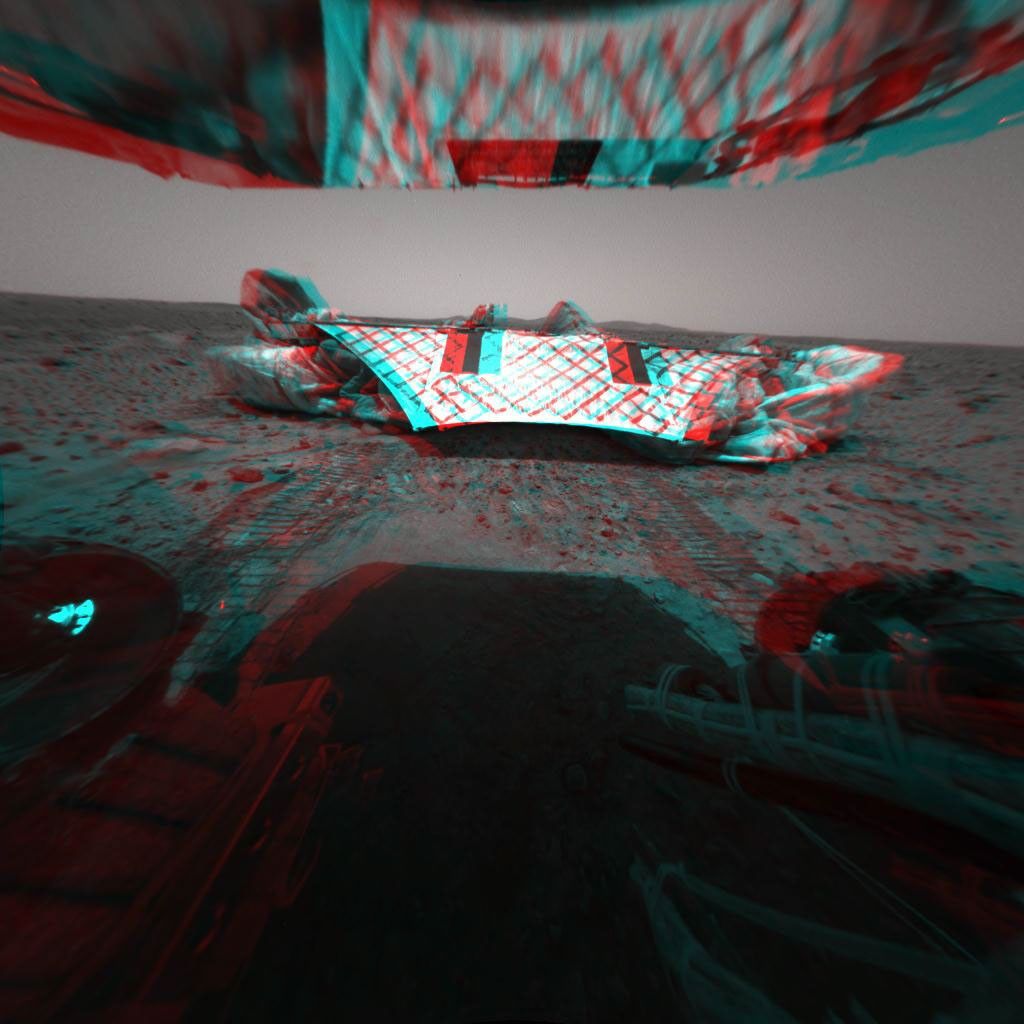 This image from the Mars Exploration Rover Spirit's rear hazard identification camera shows the rover's hind view of the lander platform, its nest for the past 12 sols, or martian days. The rover is approximately 1 meter (3 feet) in front of the airbag-cushioned lander, facing northwest. Note the tracks left in the martian soil by the rovers' wheels, all six of which have rolled off the lander. This is the first time the rover has touched martian soil.