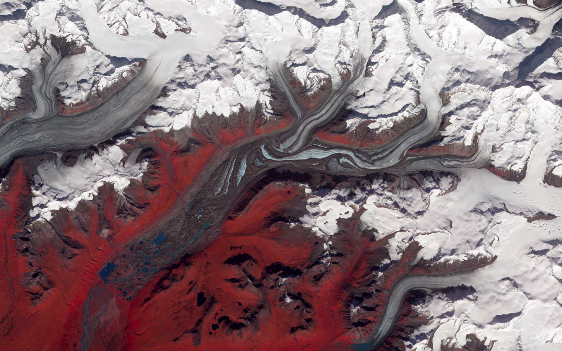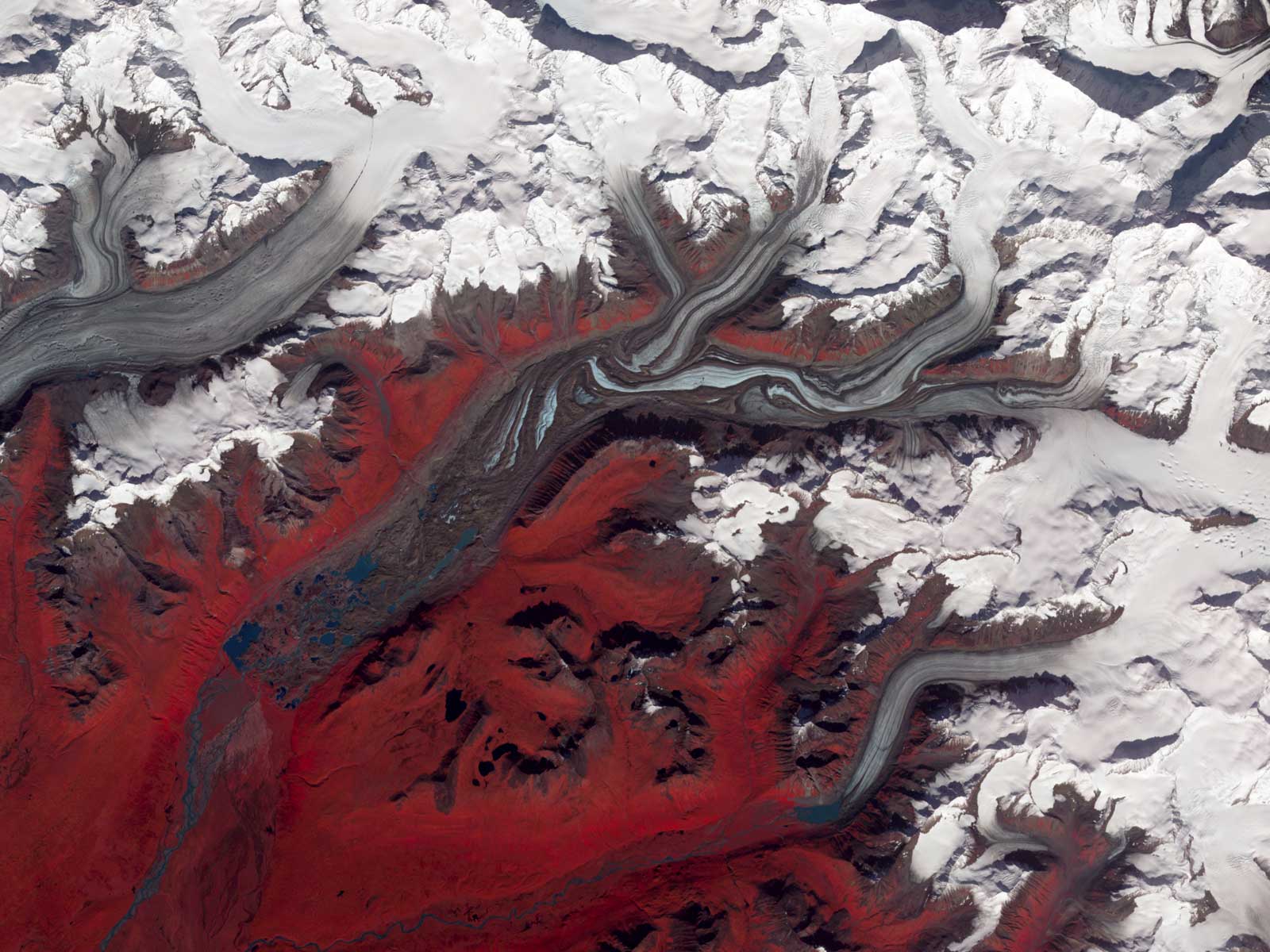 Susitna Glacier, Alaska. Like rivers of liquid water, glaciers flow downhill, with tributaries joining to form larger rivers. But where water rushes, ice crawls. As a result, glaciers gather dust and dirt, and bear long-lasting evidence of past movements. Alaska’s Susitna Glacier reveals some of its long, grinding journey in this image, taken from space on August 27, 2009. The satellite image combines infrared, red and green wavelengths to form a false-color picture. Vegetation is red and the glacier’s surface is marbled with dirt-free blue ice and dirt-coated brown ice. Infusions of relatively clean ice push in from tributaries in the north. The glacier surface appears especially complicated near the center of the image, where a tributary has pushed the ice in the main glacier slightly southward. In the lower left corner of this image, meltwater lakes can be seen on top of the ice.