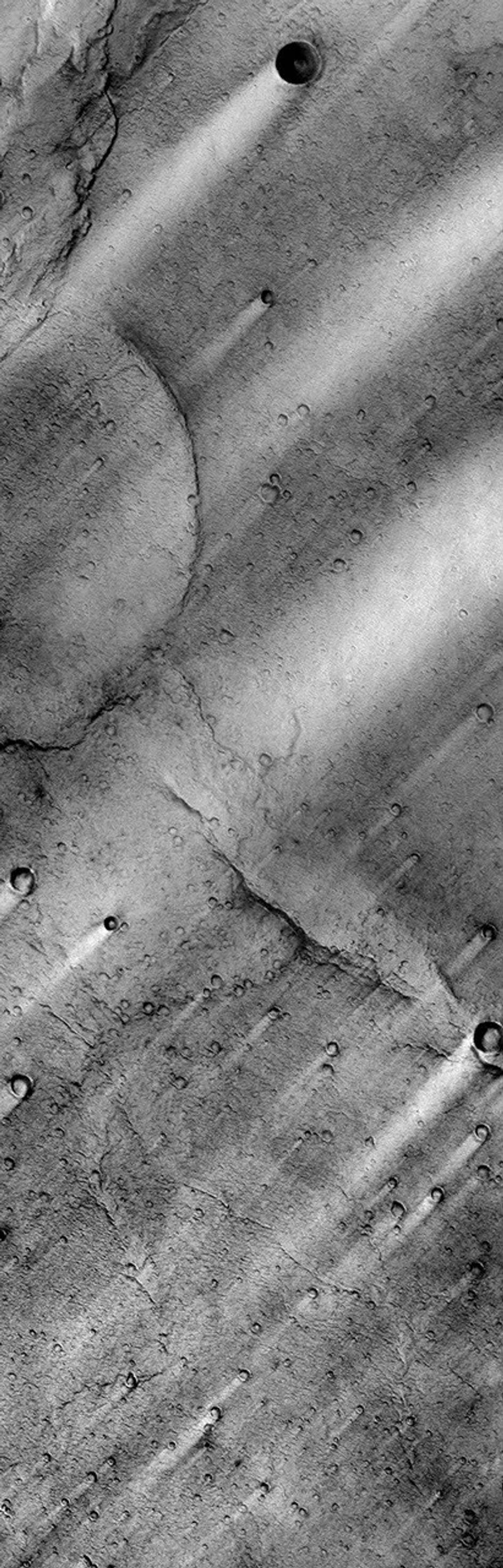 This image is near the southern edge of a low, broad volcanic feature called Syrtis Major. A close look at this image reveals a wrinkly texture that indicates a very rough surface that is associated with the lava flows that cover this region. On a larger scale, there are numerous bright streaks that trail topographic features such as craters. These bright streaks are in the wind shadows of the craters where dust that settles onto the surface is not as easily scoured away. It is important to note that these streaks are only bright in a relative sense to the surrounding image. Syrtis Major is one of the darkest regions on Mars and it is as dark as fresh basalt flows or dunes are on Earth.